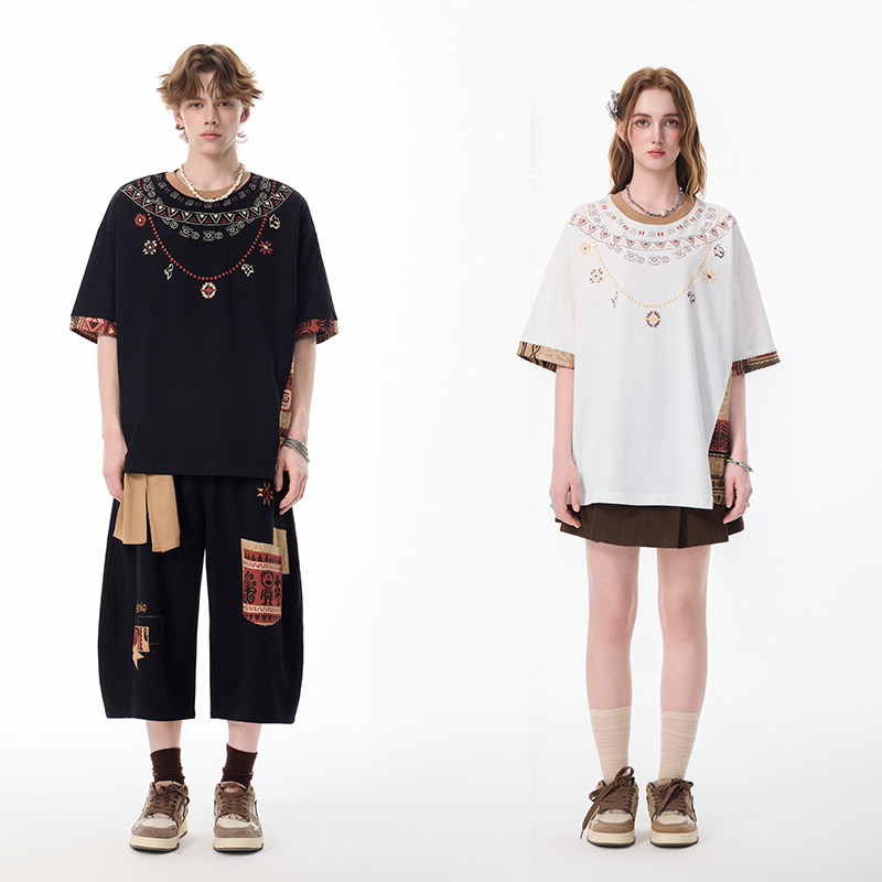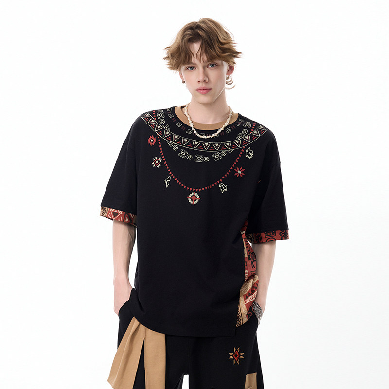 --------------------- LAMLICKA复古民族风黑色短袖t恤男夏季凉感潮牌宽松撞色拼接上衣 --------------------- --------------------- 【原价】258元 【券后价】129元