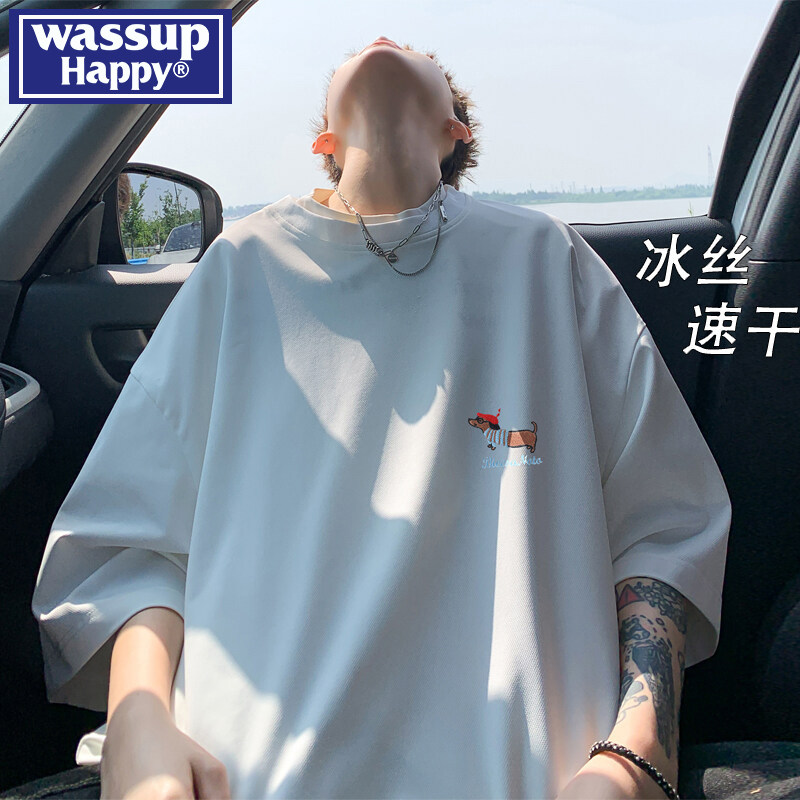 wassup happy美式腊肠狗冰丝短袖t恤男士夏季薄款青少年圆领半袖