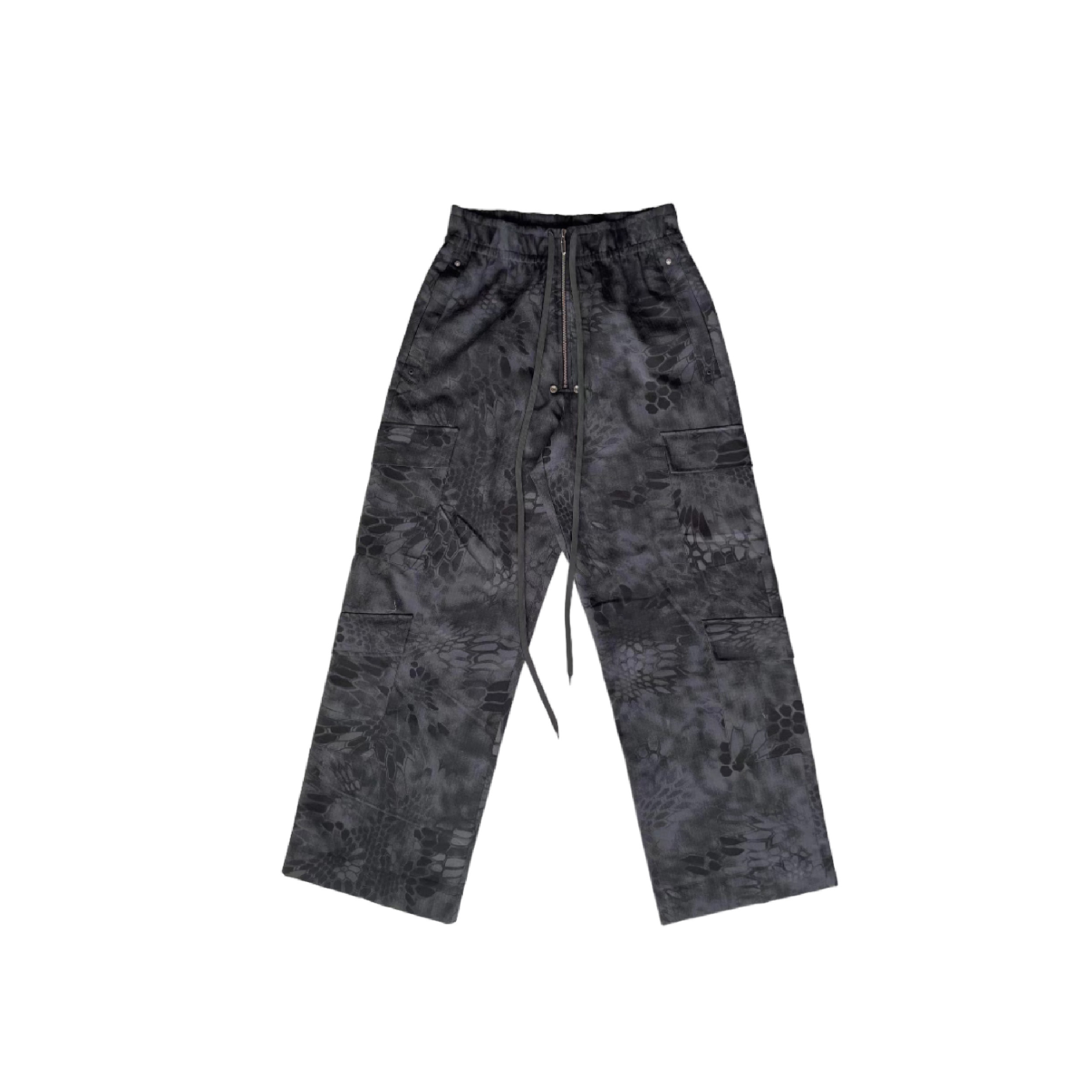 NIIPLICITY 23SS 黑斑迷彩龙鳞重工多口袋铆钉飘带长裤