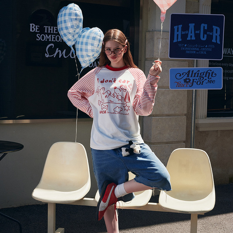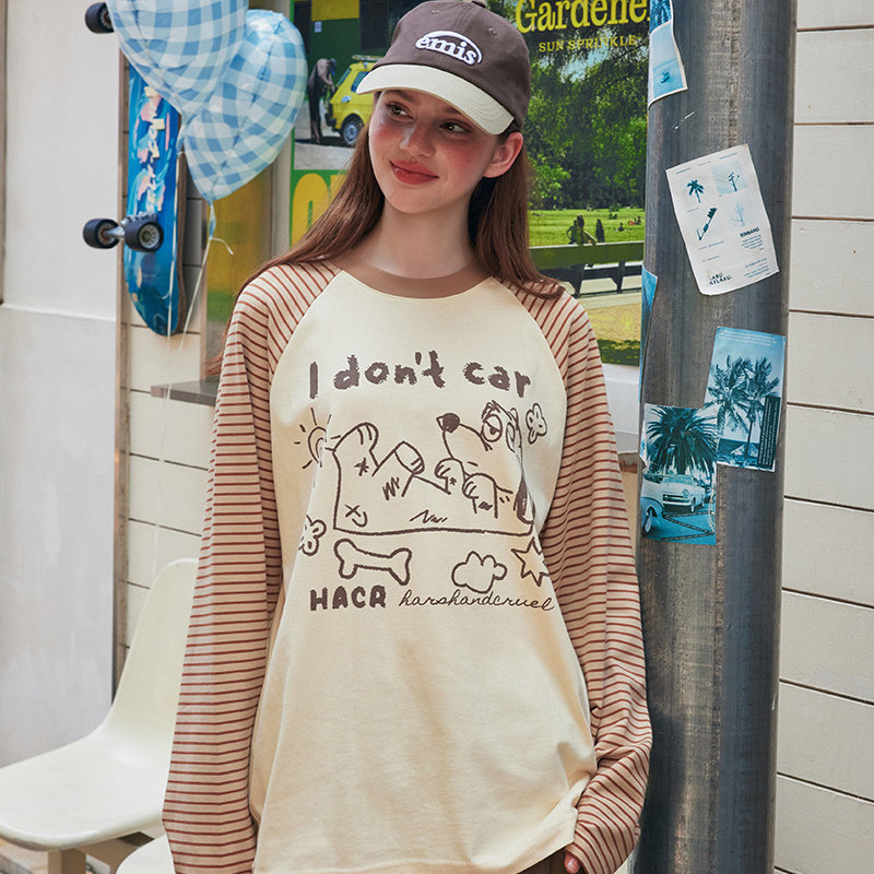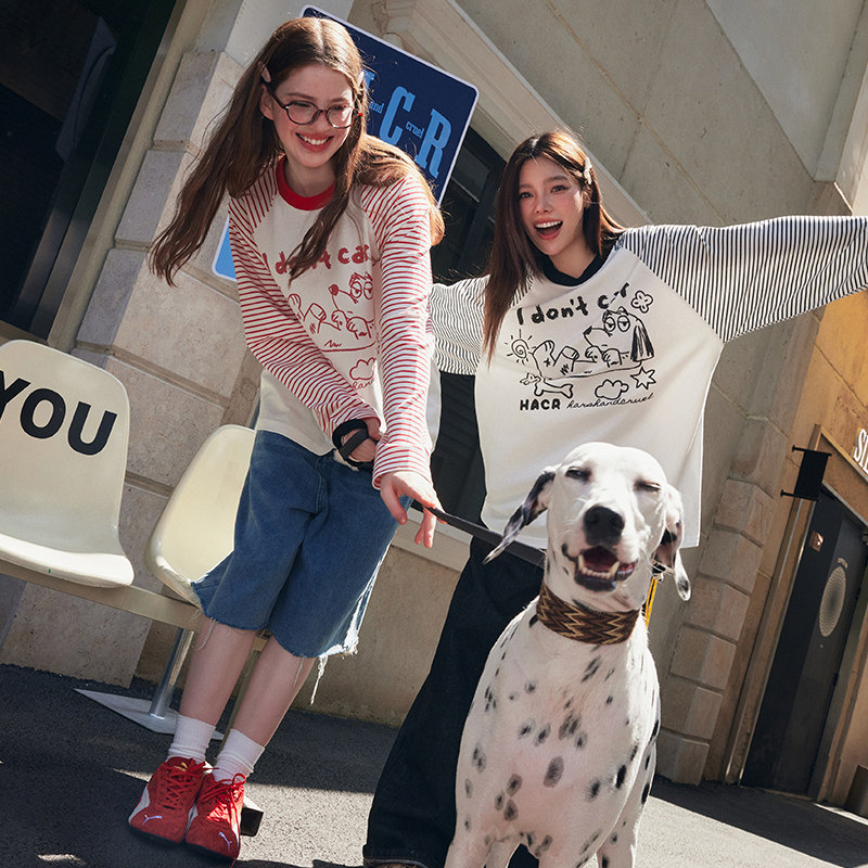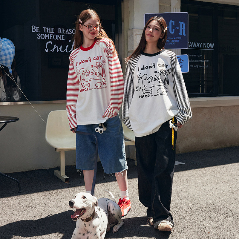 HACR手绘小狗插肩袖长袖t恤 早秋国潮宽松慵懒感情侣装t恤男女