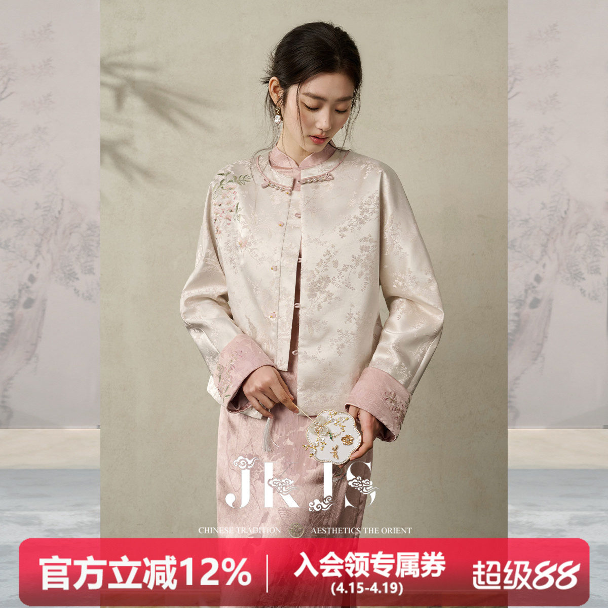 --------------------- JKJS【凝霜帛】人丝提花刺绣新中式外套春季2026新款气质女士上衣 【原售价】559元 【现售价】403元 【推荐理由】