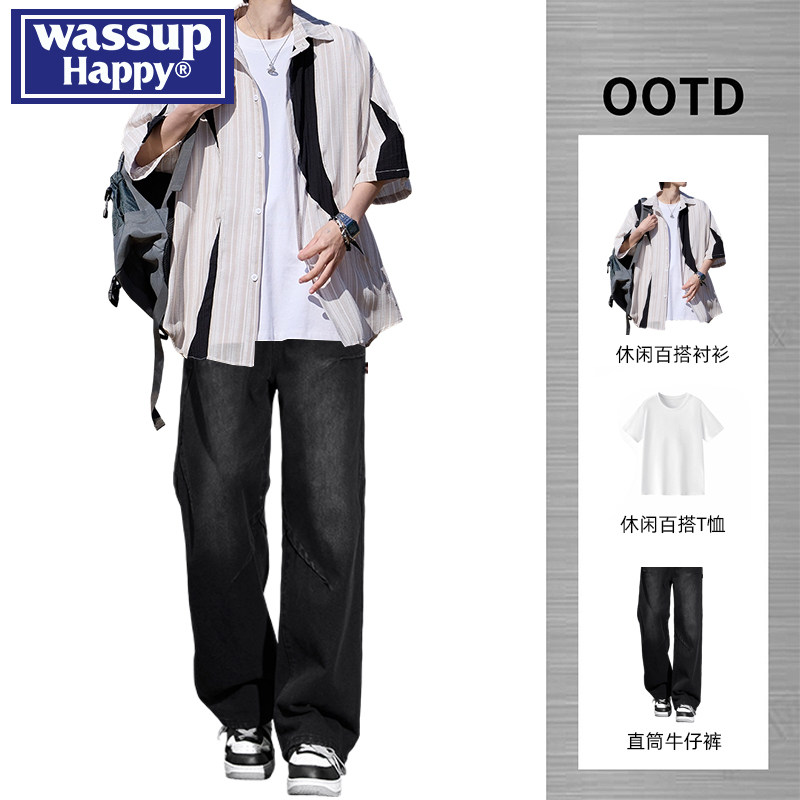 wassup happy条纹撞色七分袖衬衫男夏季潮牌男装痞帅气穿搭配一套