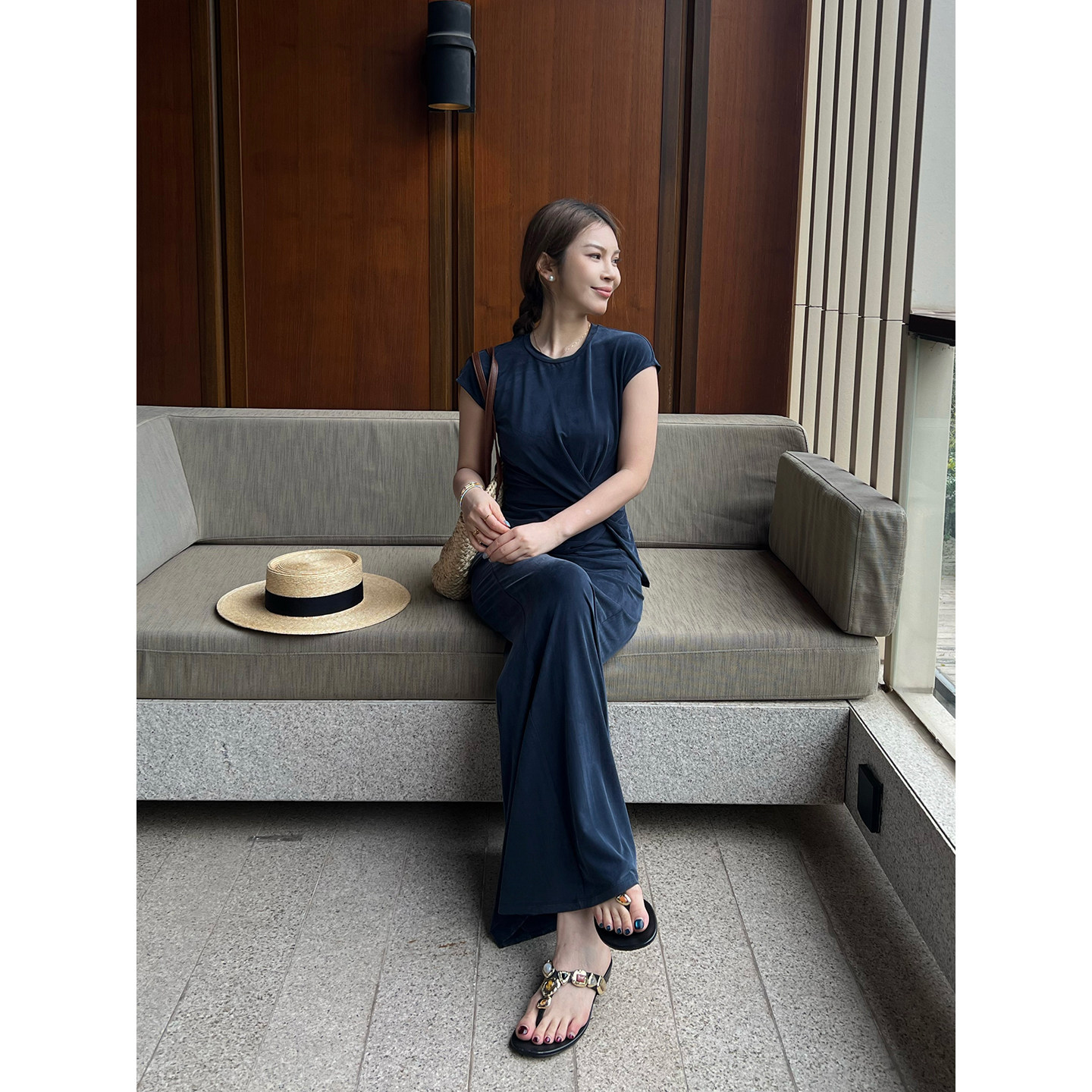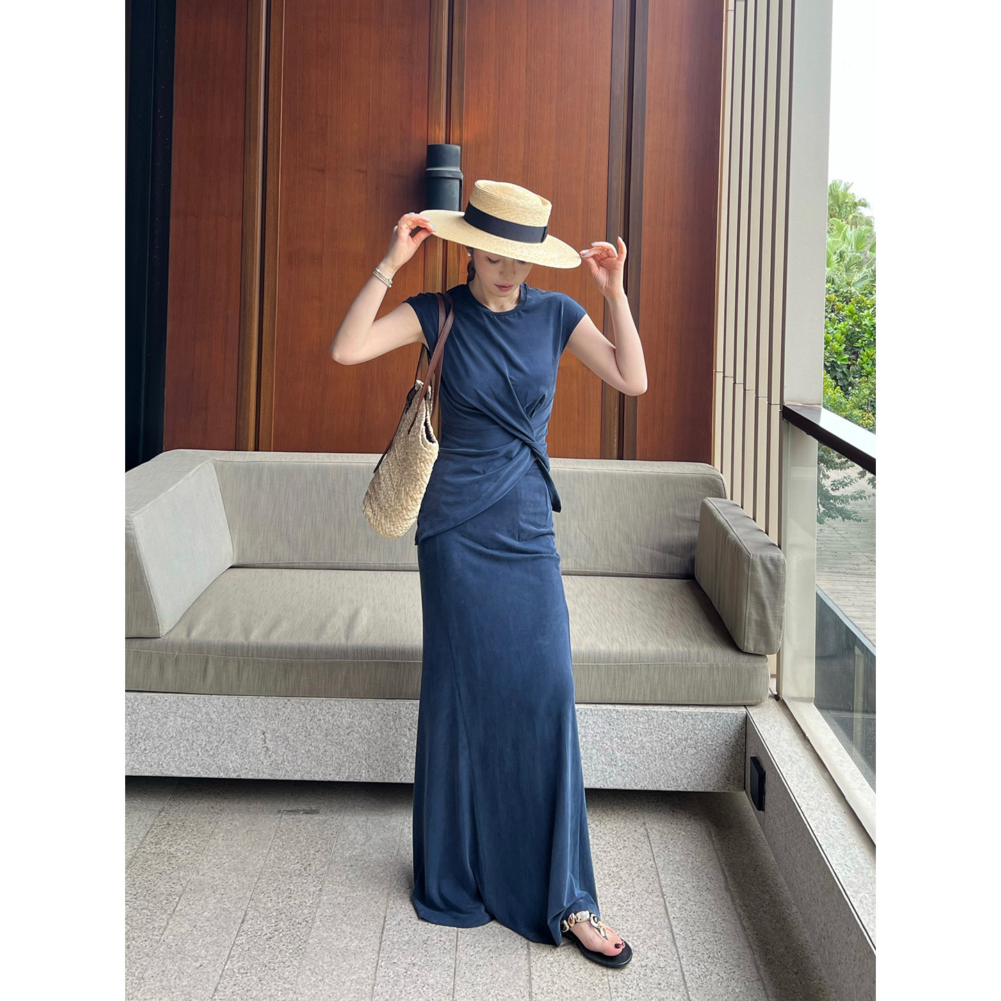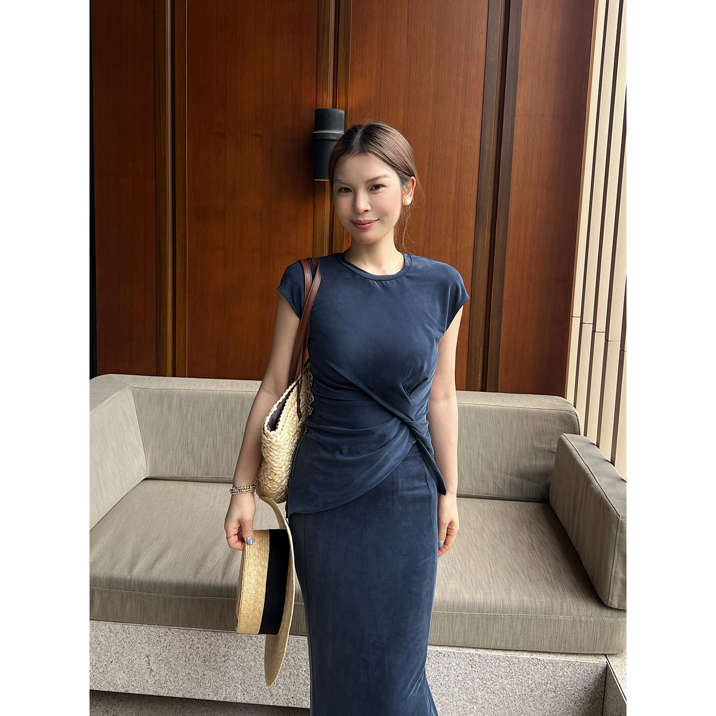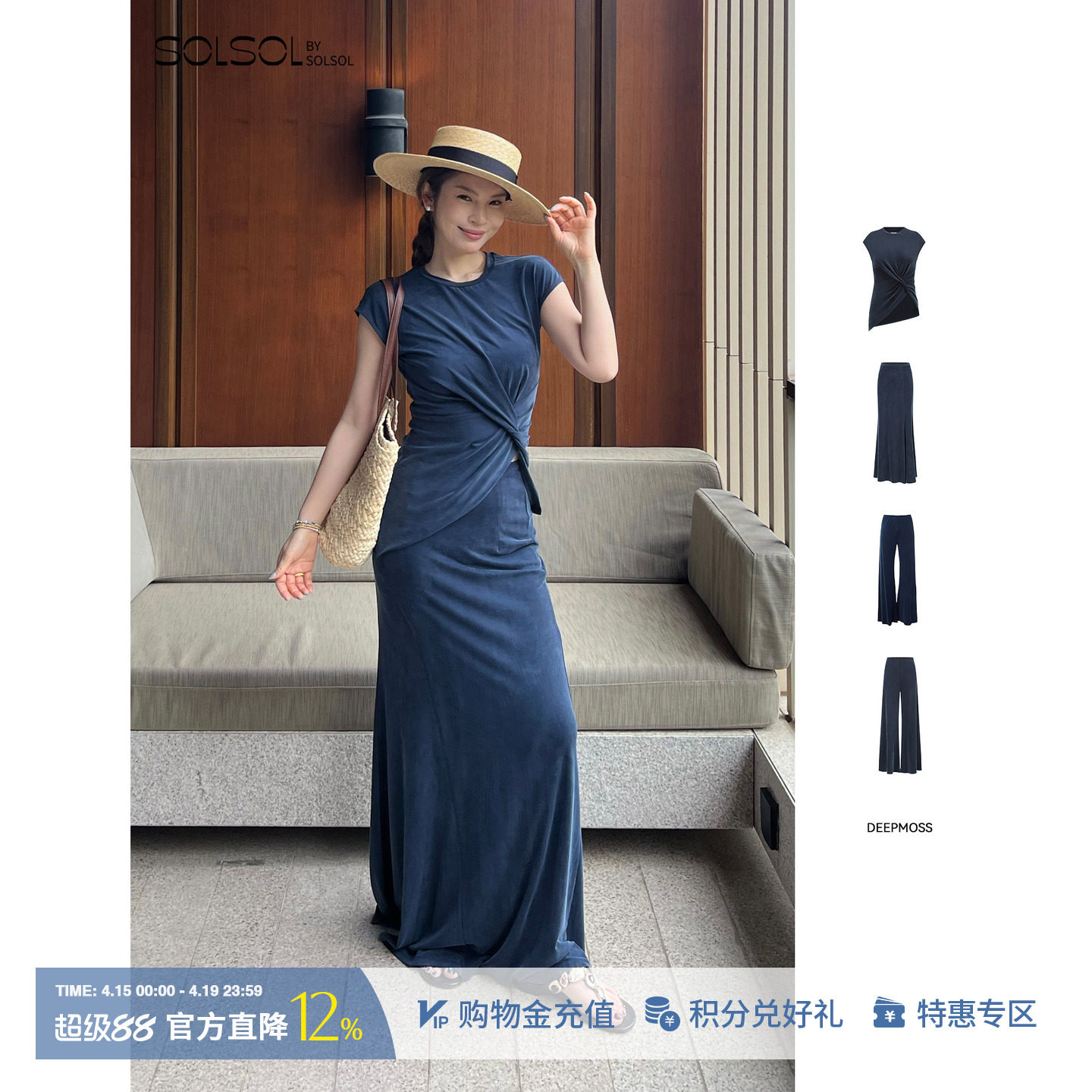 --------------------- DEEPMOSS 26春夏新款智性蓝羽绵扭摺上衣/微喇长裤/鱼尾裙 SOLSOL 【原售价】1280元 【现售价】1152元 【推荐理由】