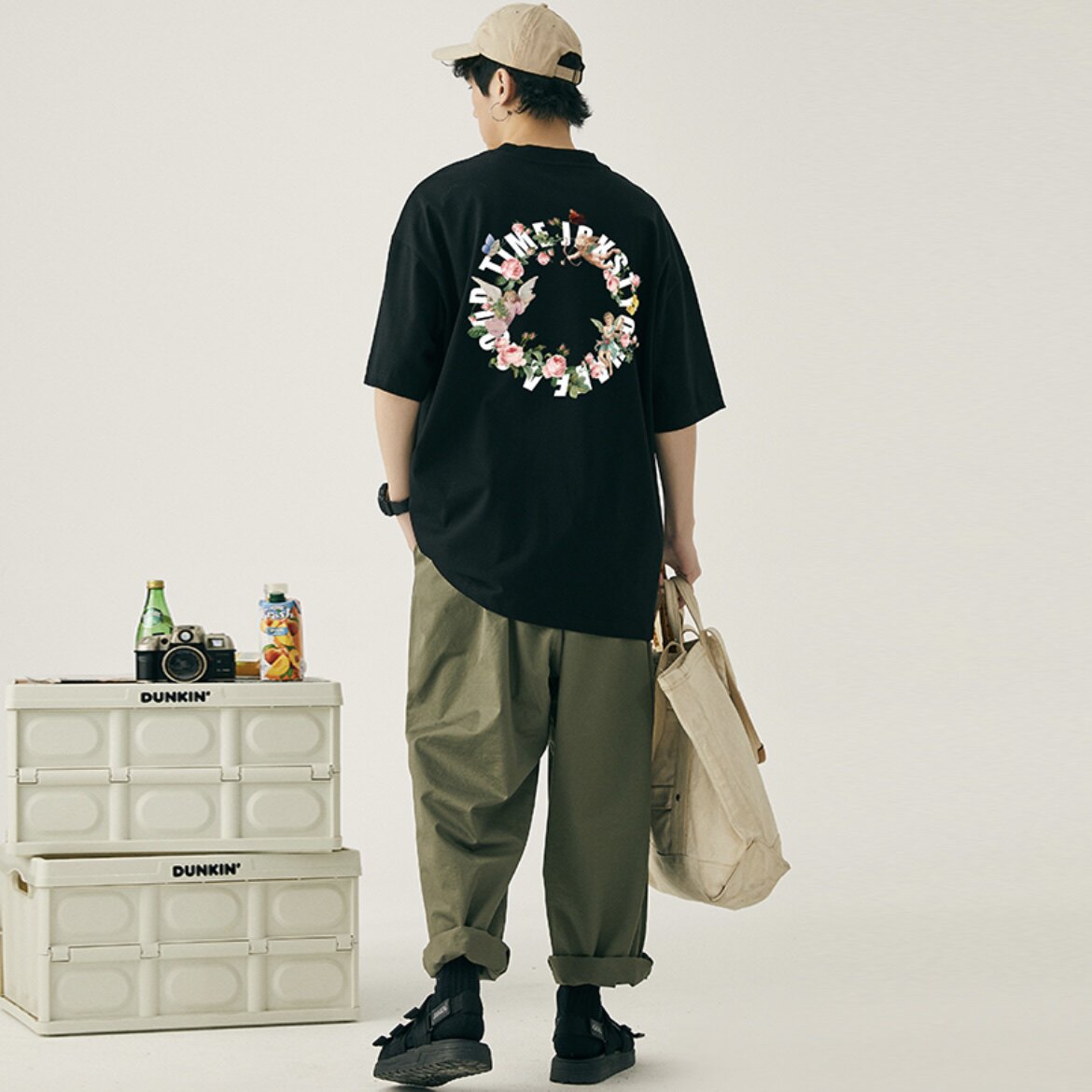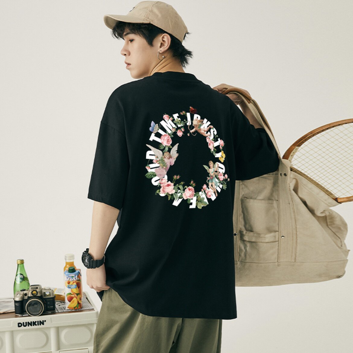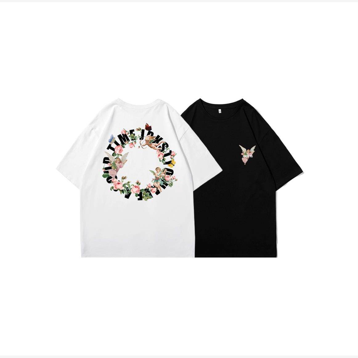 KIKSTYO 丘比特小天使玫瑰花朵字母环绕圈印圆领短袖T恤男女同款