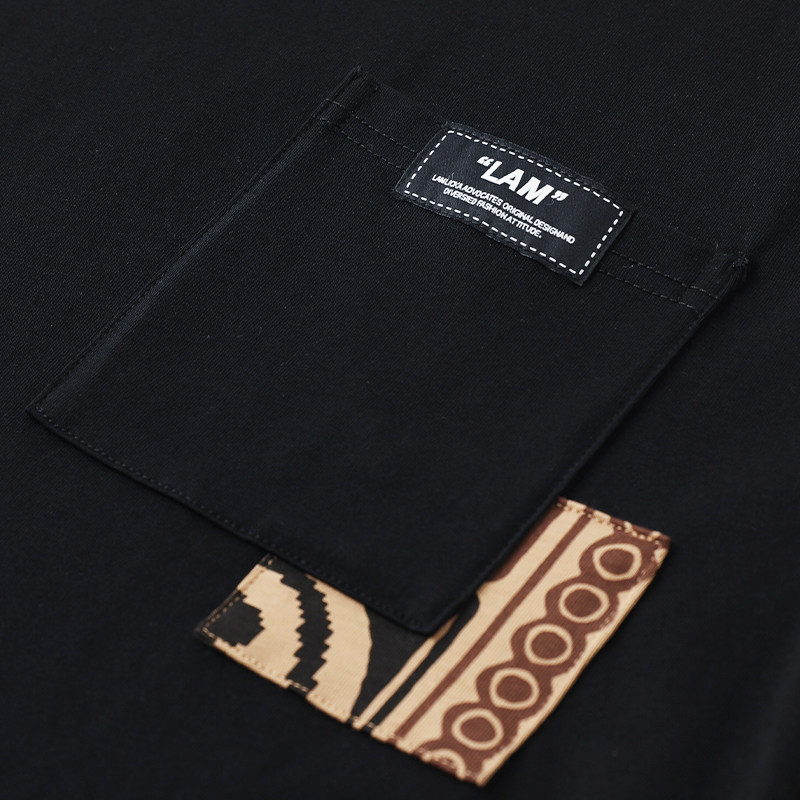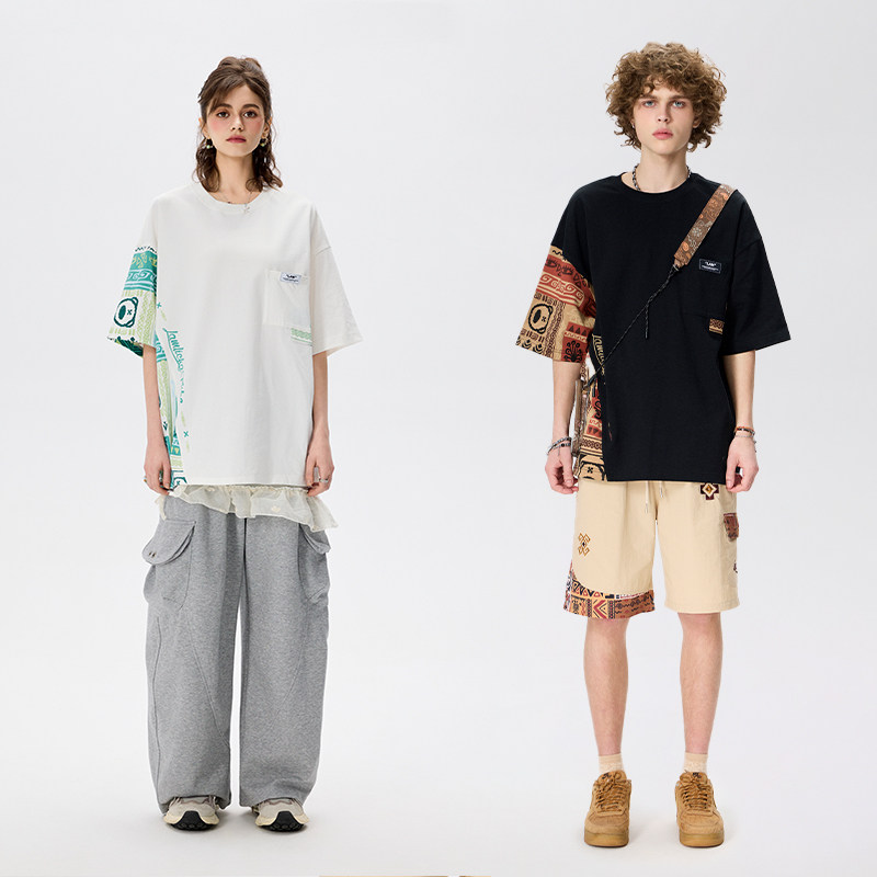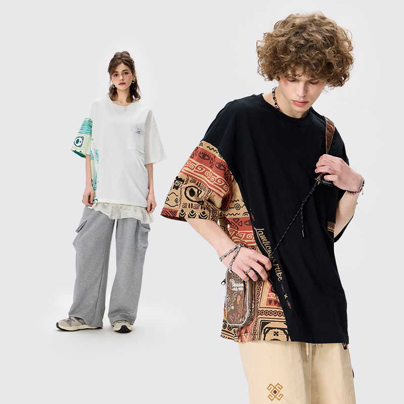 LAMLICKA民族风拼接印花t恤重磅美式高街圆领百搭短袖宽松慵懒风