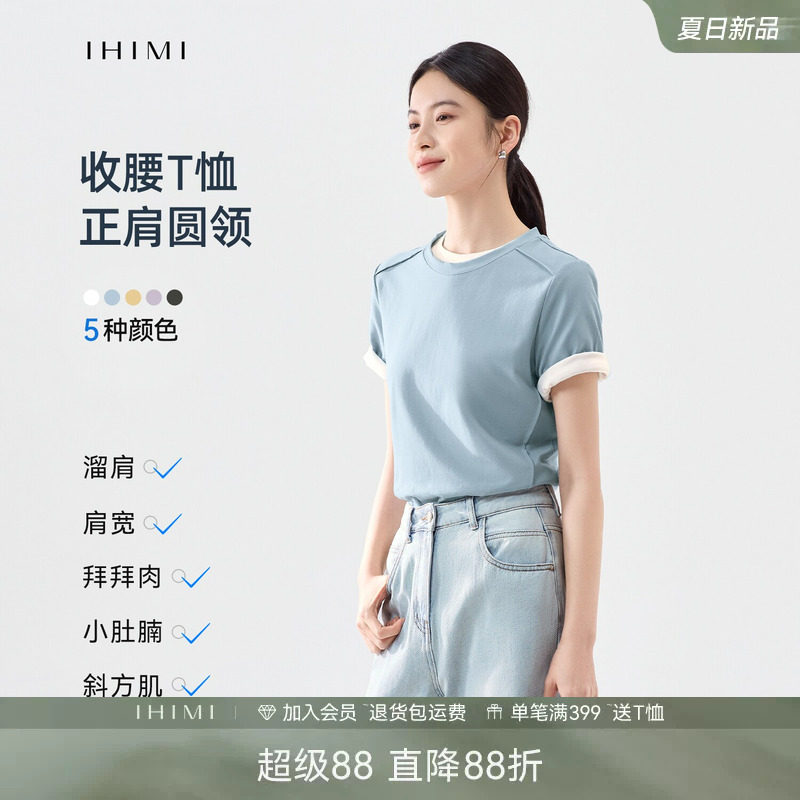 IHIMI海谧简约圆领纯色棉T恤女2026夏季新款修身短袖显瘦百搭上衣