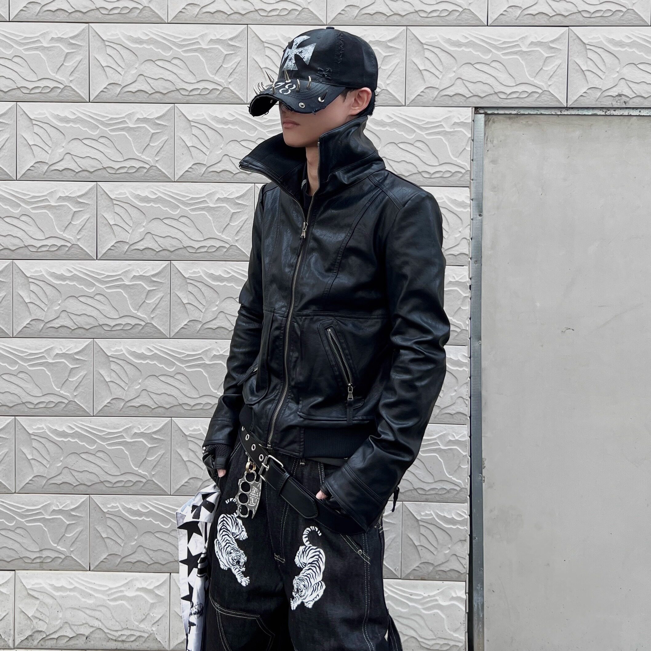 YIZILINGF 小众设计感修身显瘦皮衣外套小个子短款机车服立领夹克