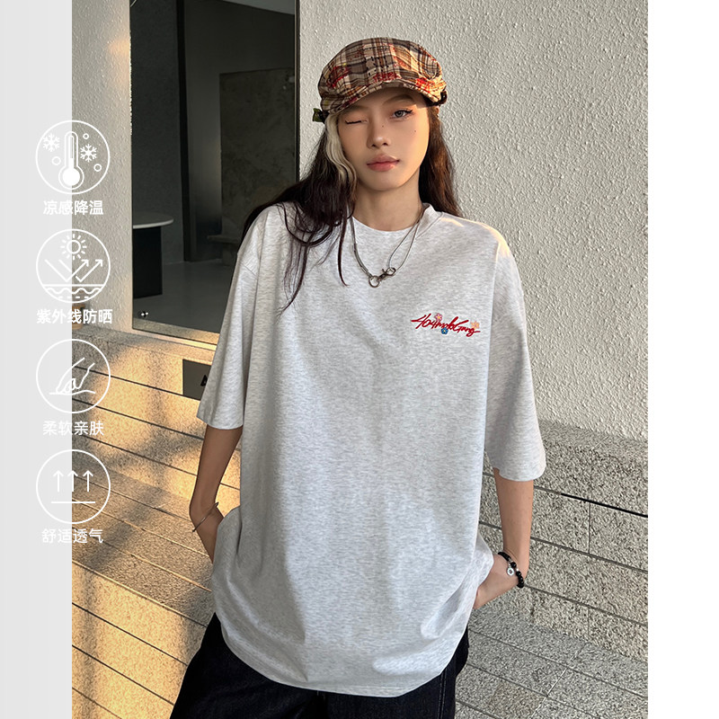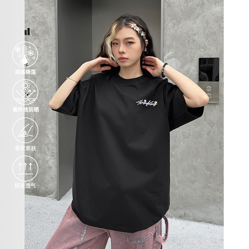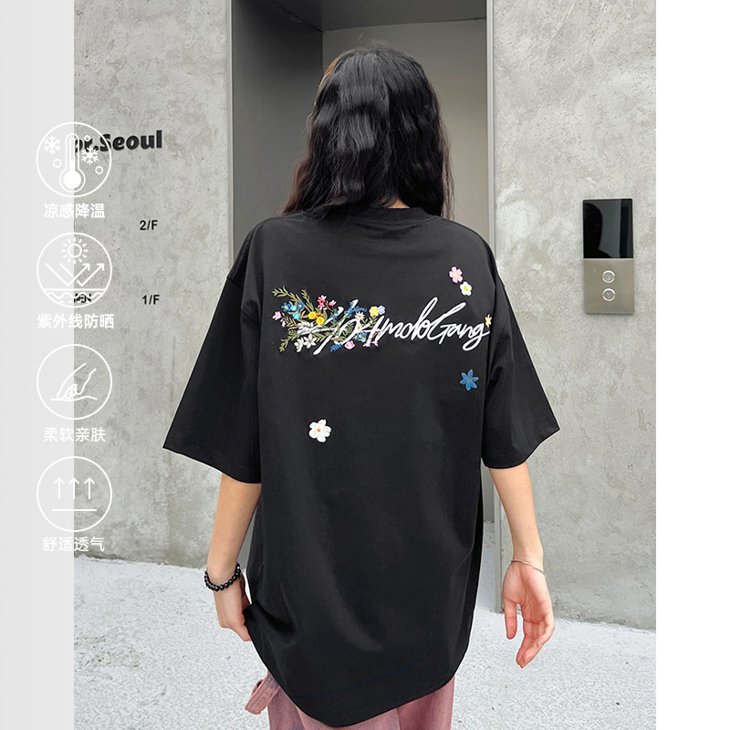 [徐艺洋同款]404MOB手写花卉刺绣短袖T恤男女款美式宽松凉感防晒t