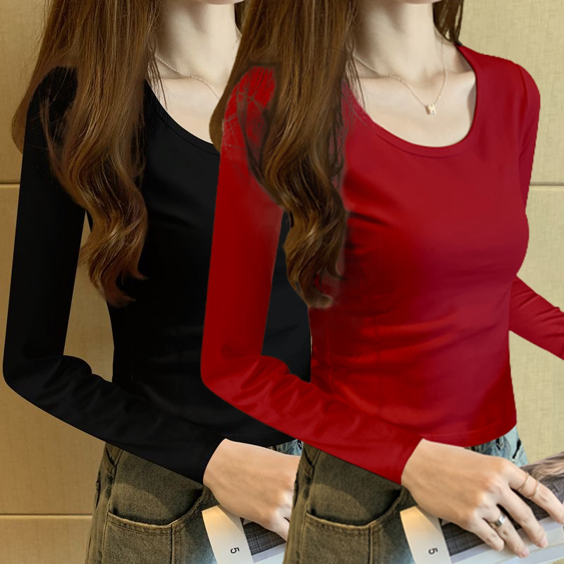 纯色打底衫女内搭2024年春秋新款修身纯棉长袖t恤女正肩圆领上衣T