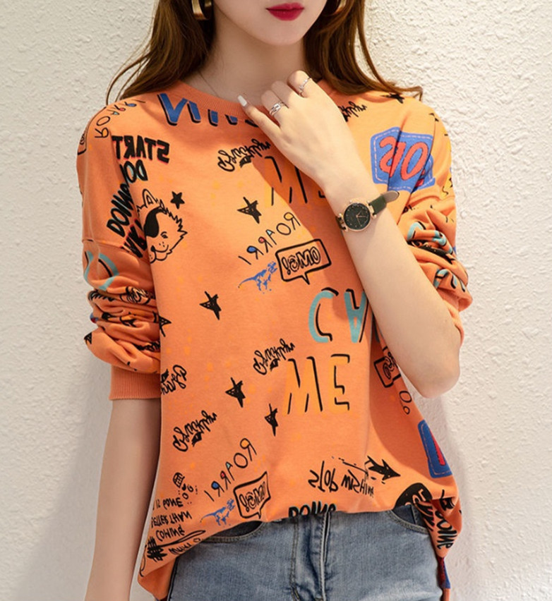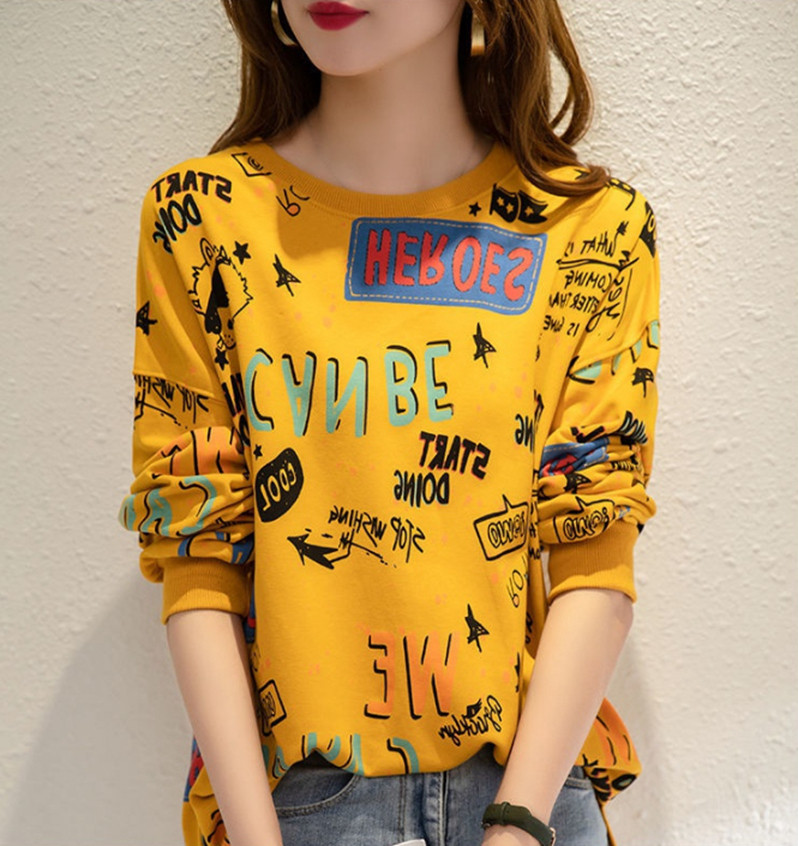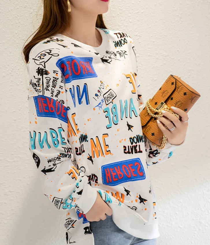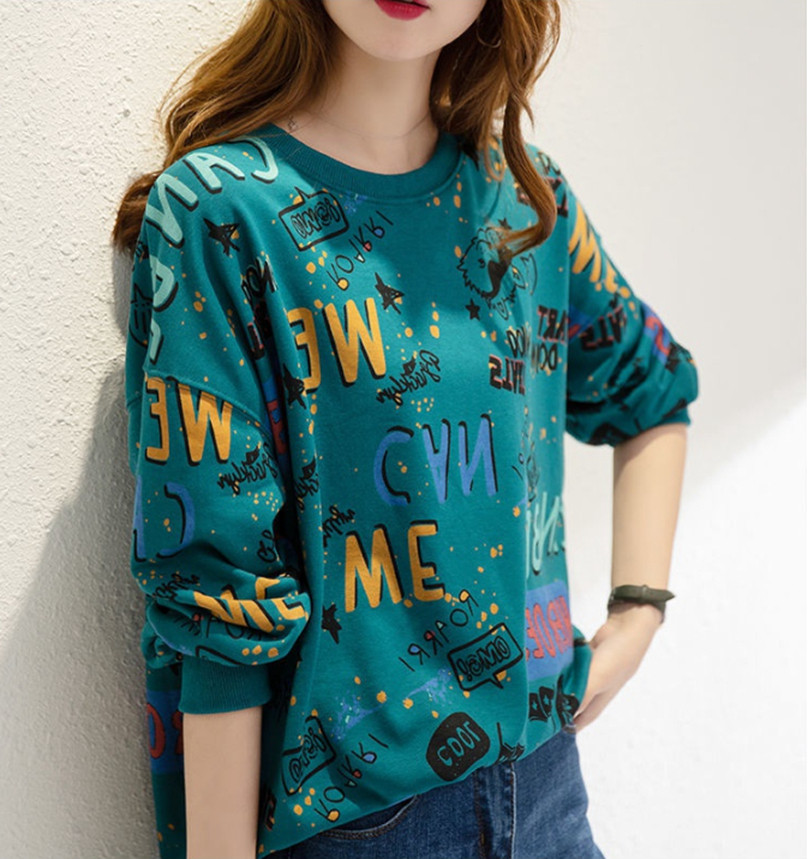 淘宝韩版春秋薄款卫衣长袖字母T恤宽松印花外套圆领女士套头上衣无帽
