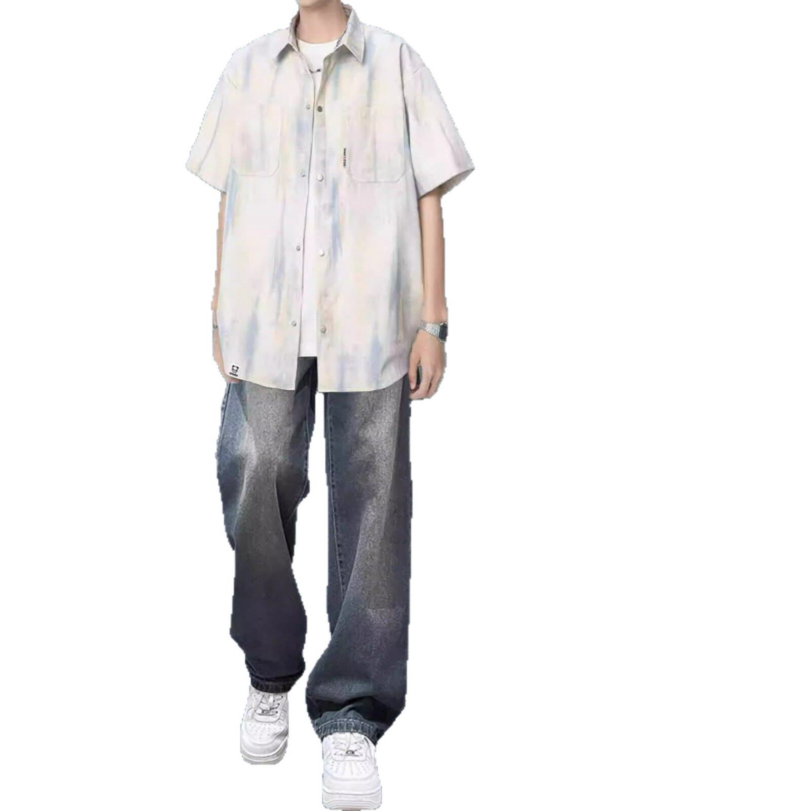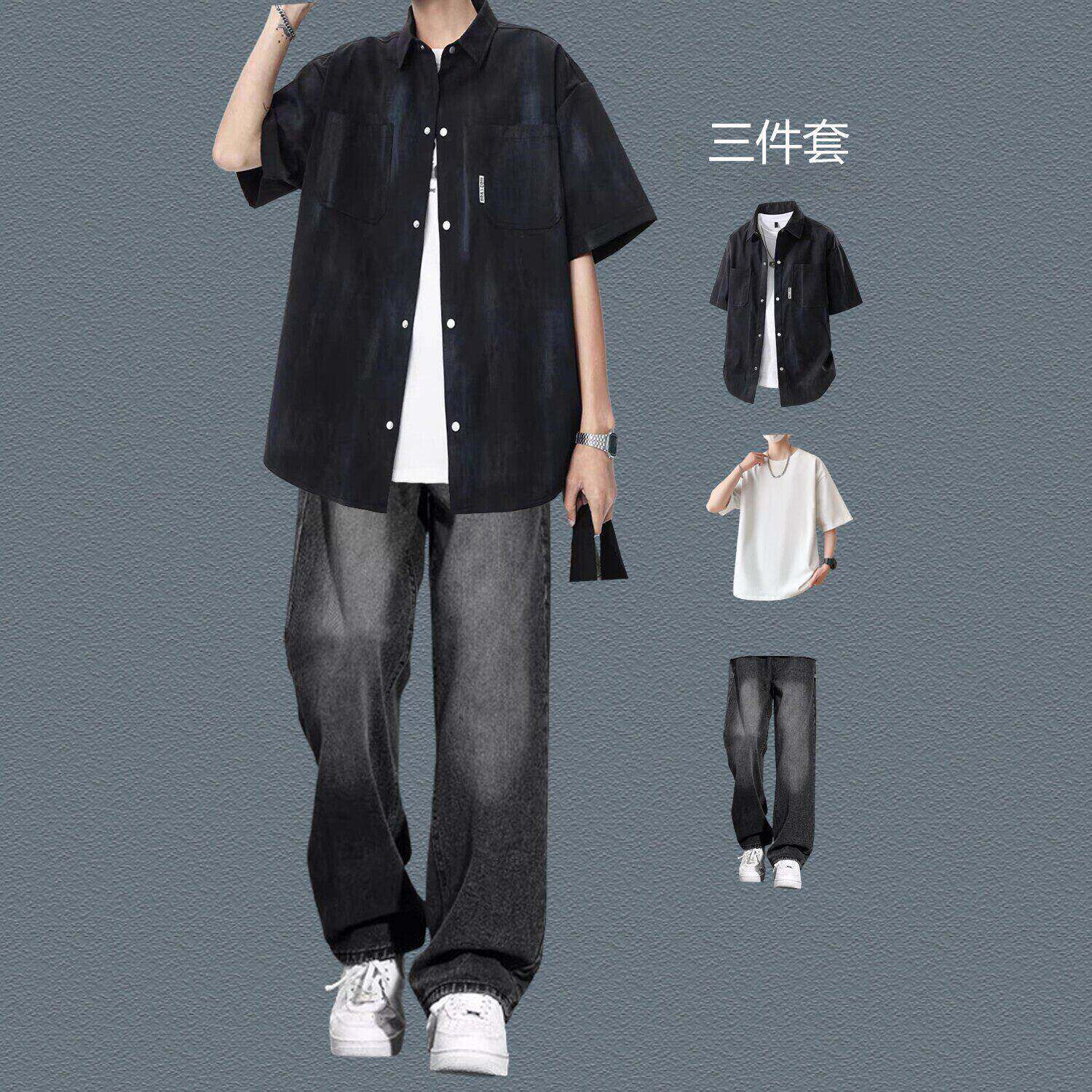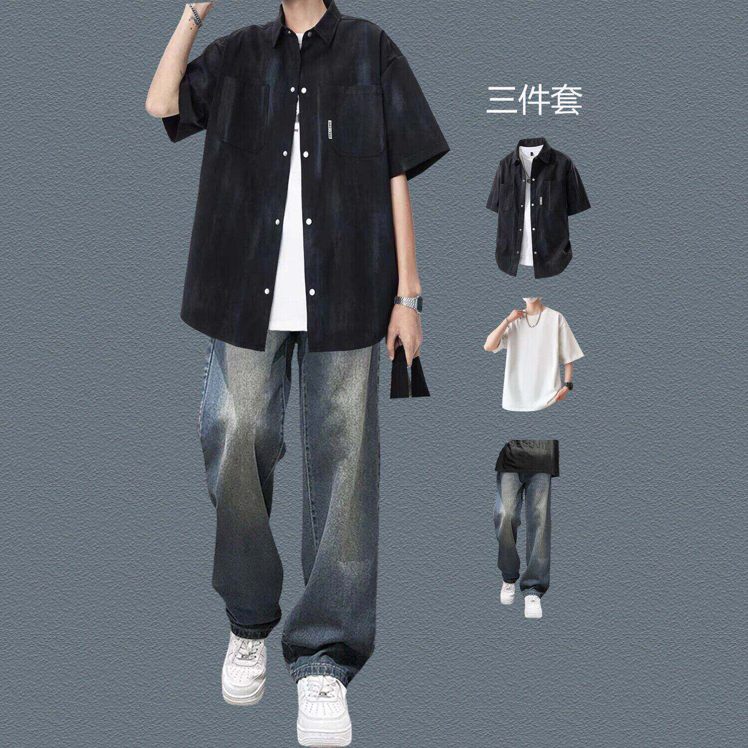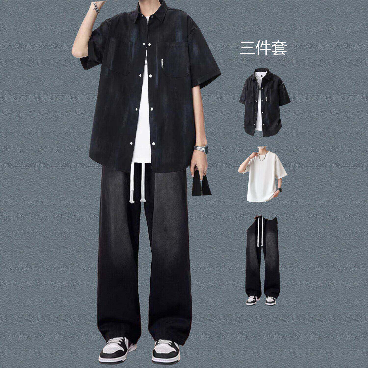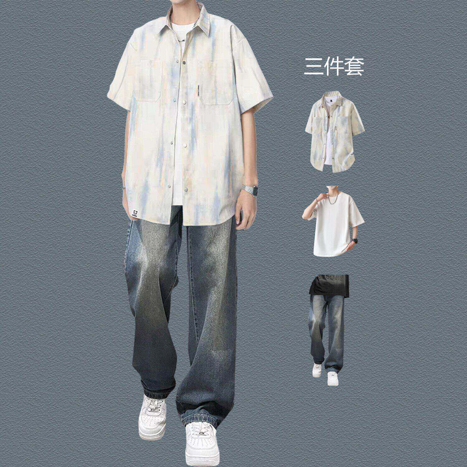 bentidea 夏季套装男港风潮流扎染短袖衬衫休闲帅气一套感学生