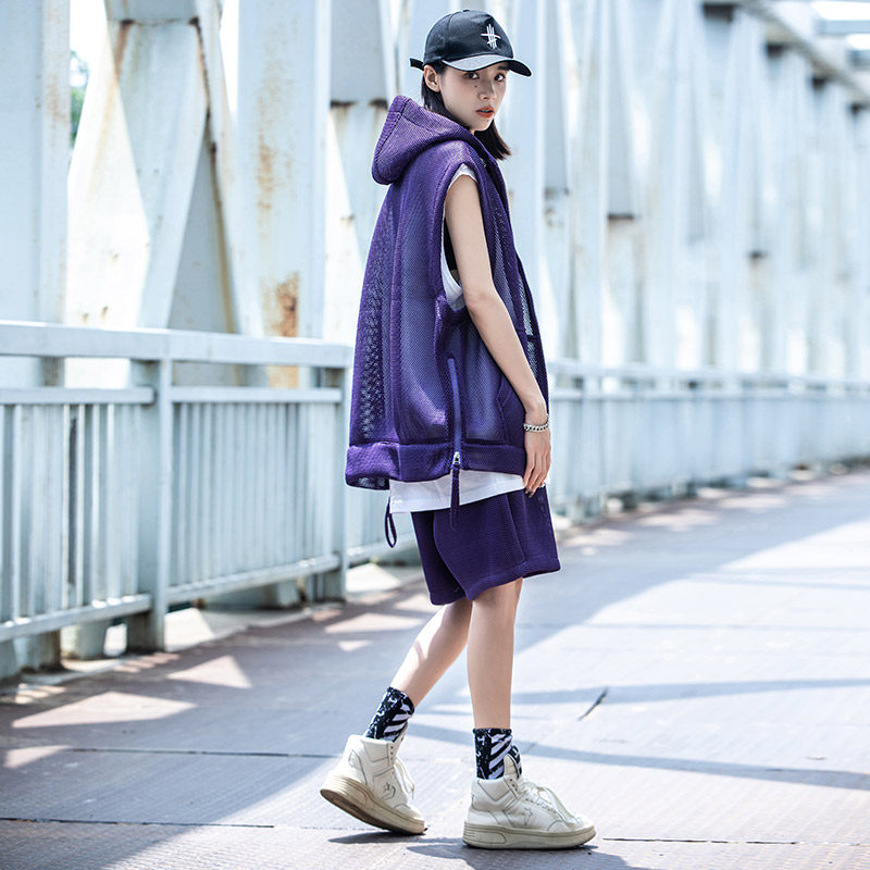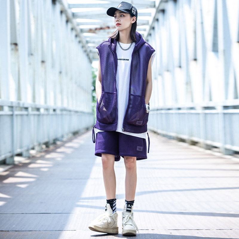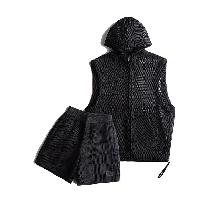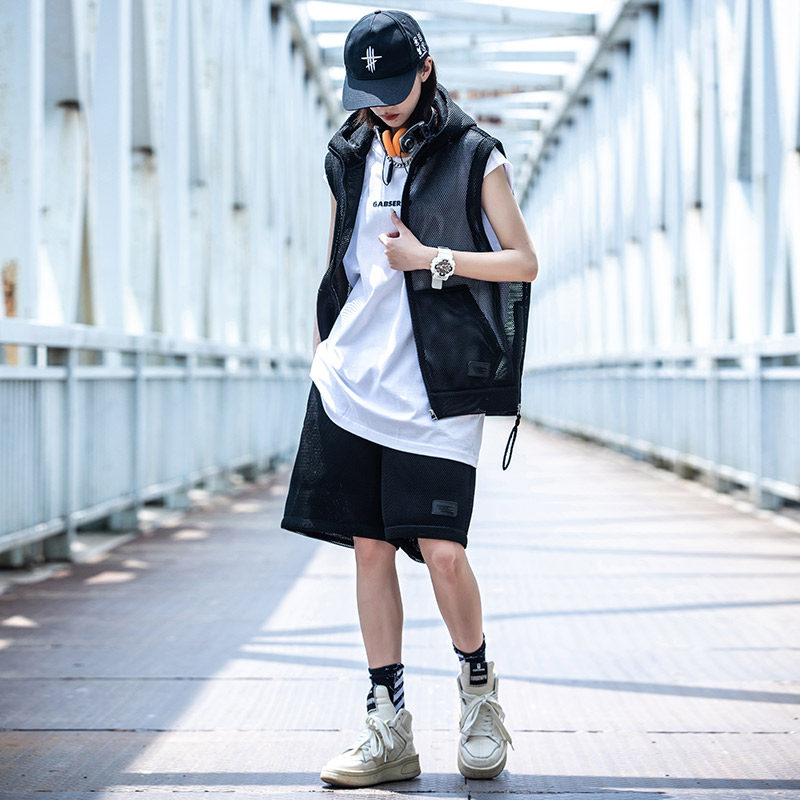 AOGZ国潮牌网格透气镂空套装男女夏季时尚运动短裤马甲薄款空调服