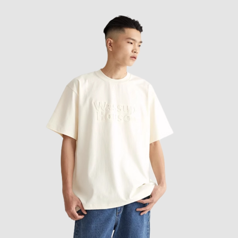 wassuphouse压印短袖t恤男女夏季国潮牌流纯棉米白色圆领简约上衣