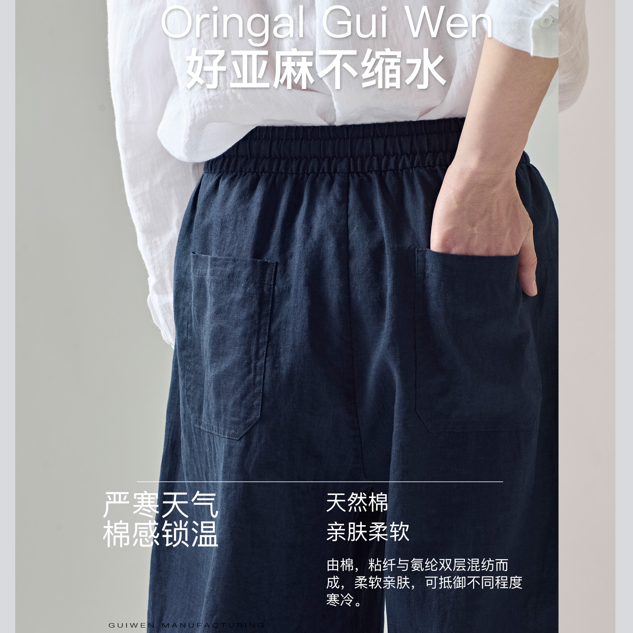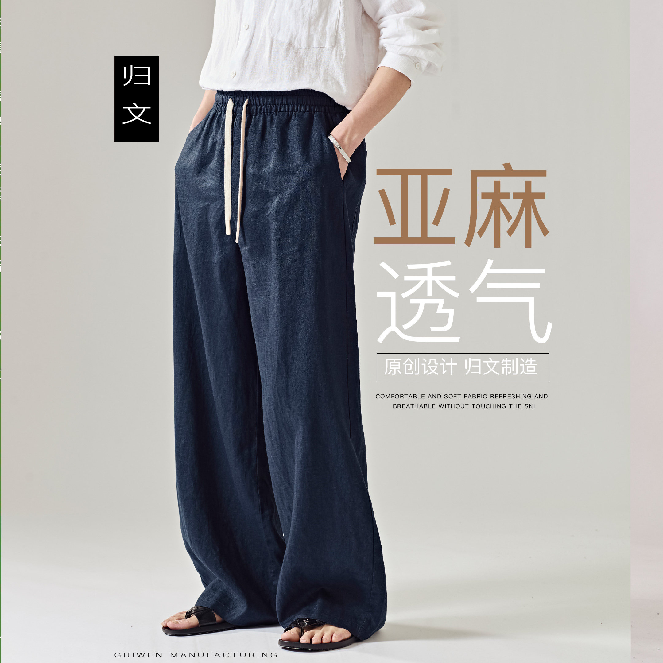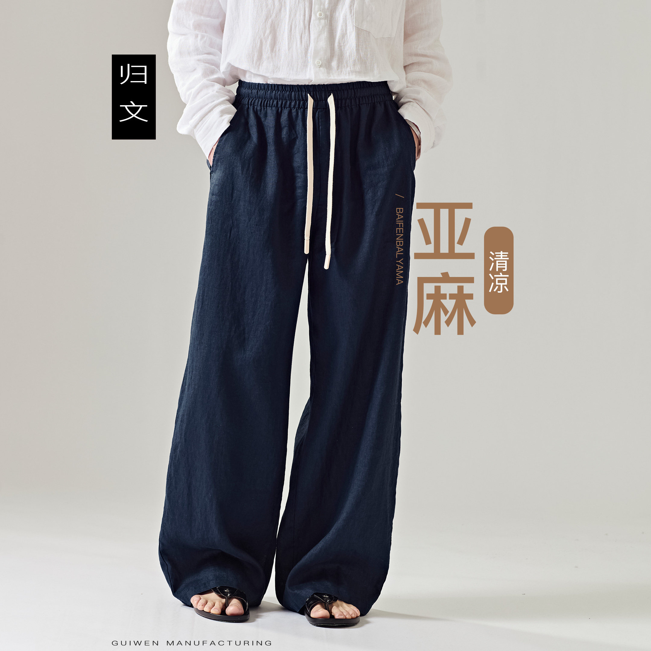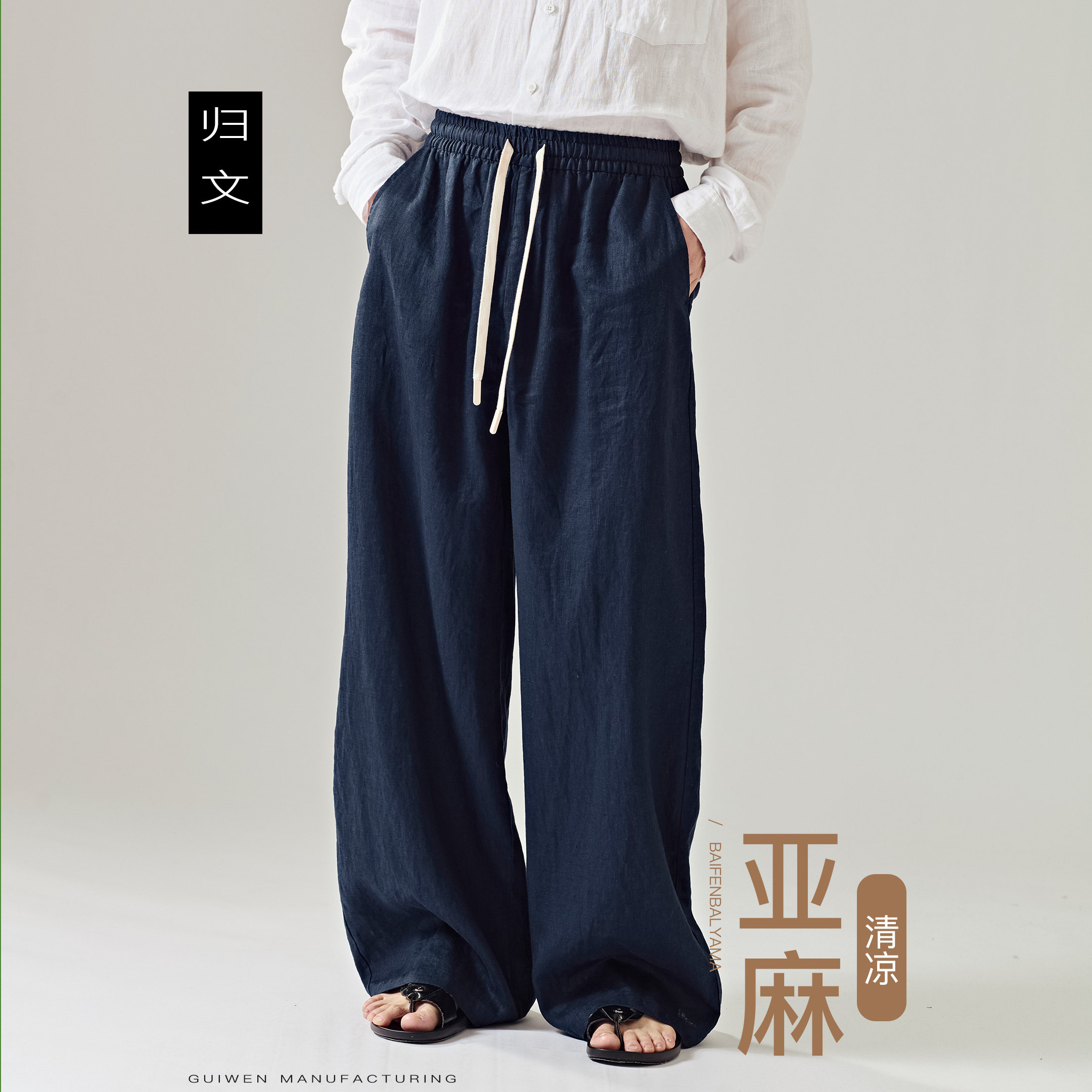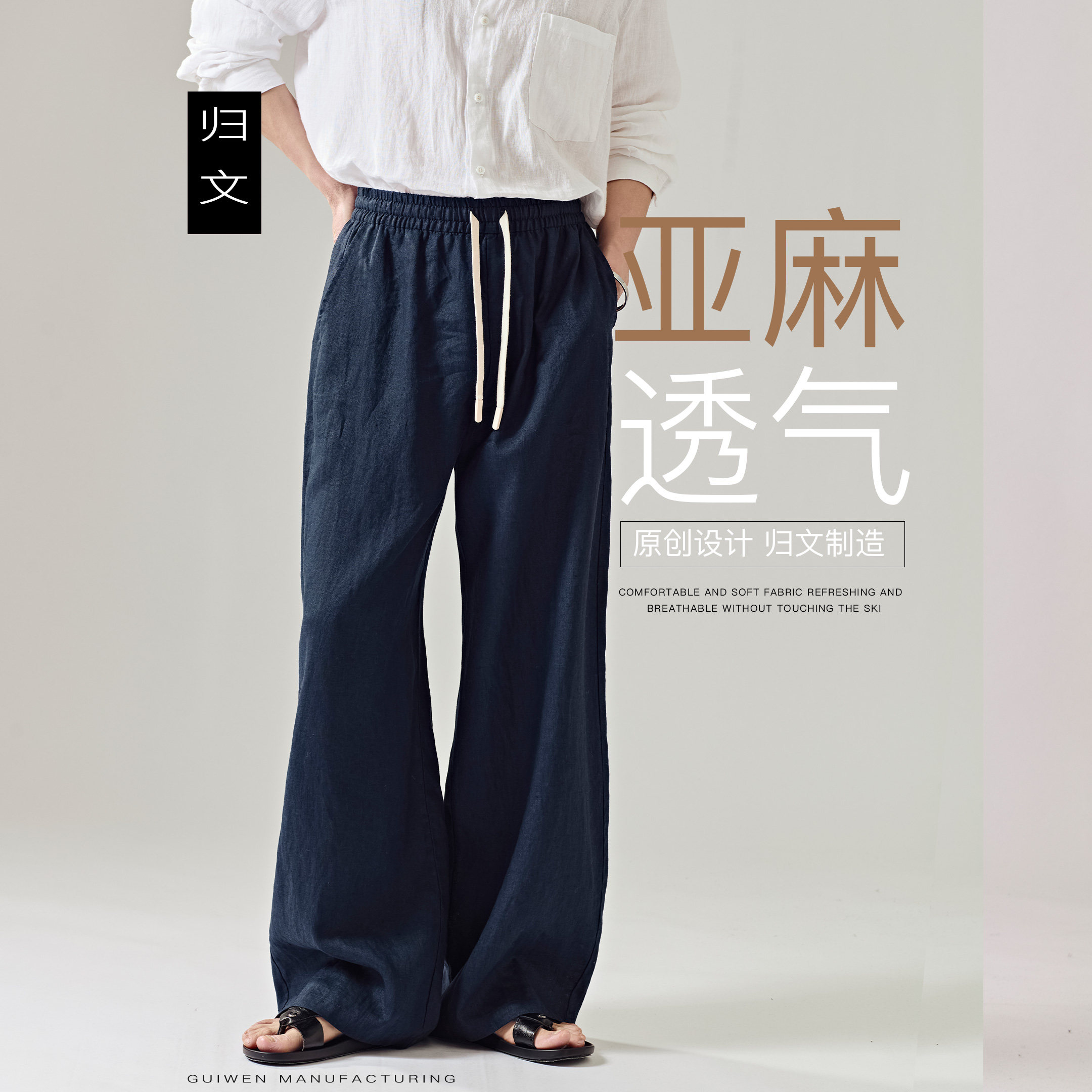 淘宝纯亚麻阔腿裤男松紧腰抽绳弯刀裤宽松垂感休闲长裤男透气大码男裤