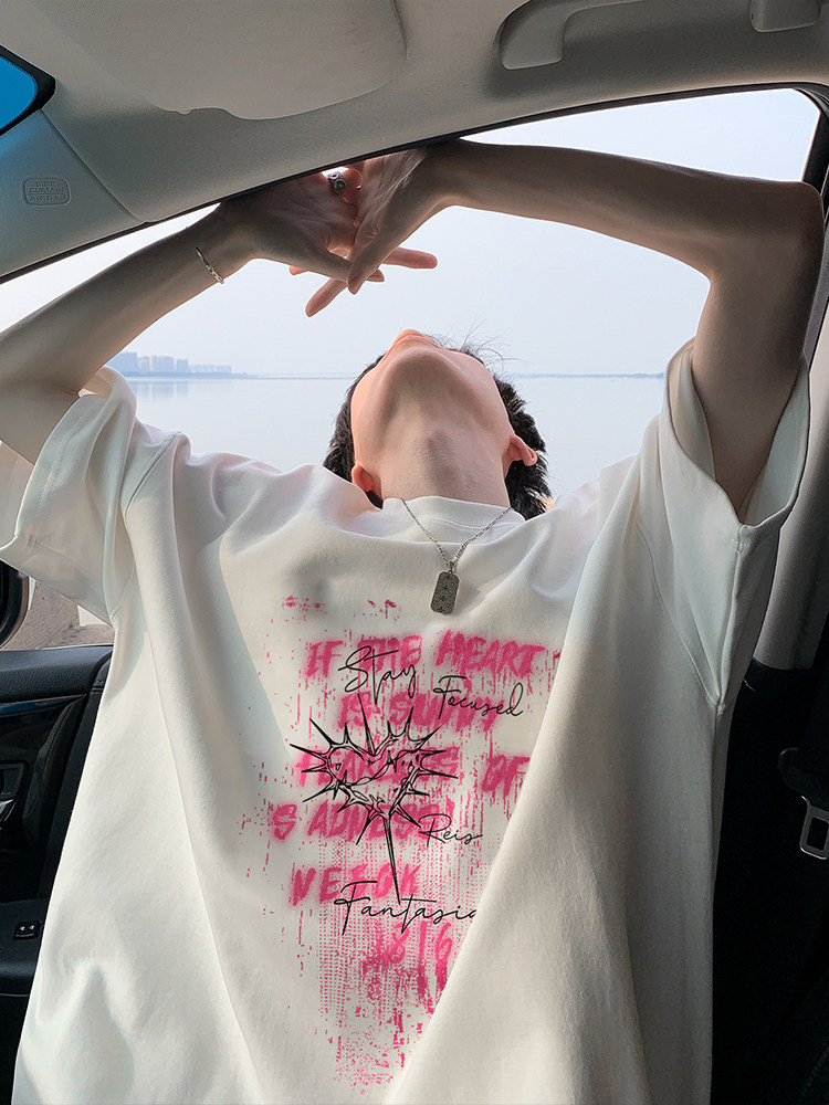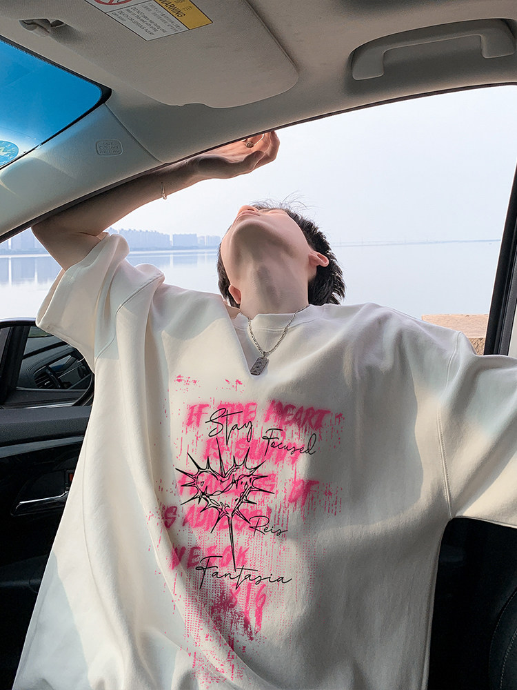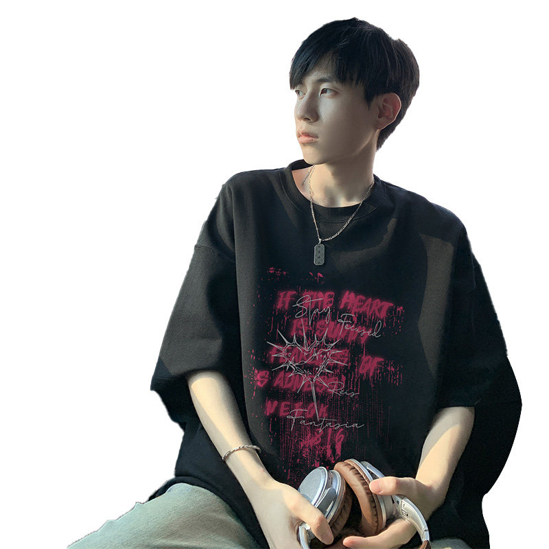 wassup happy短袖t恤男夏季美式模糊字母五分袖宽松休闲重磅体恤
