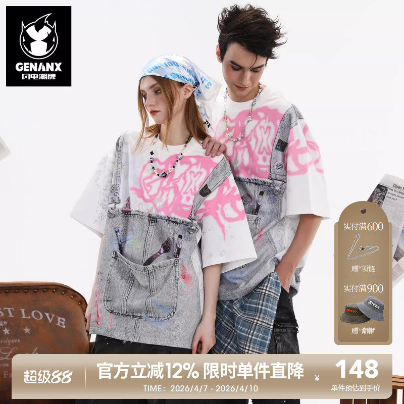 【明星同款】GENANX闪电潮牌夏新品短袖太空棉趣味设计假两件T恤