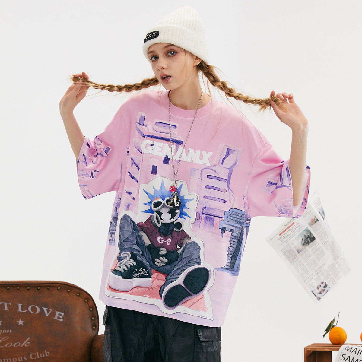 GENANX闪电潮牌2025夏季新品上衣圆领透气宽松街头太空棉印花T恤