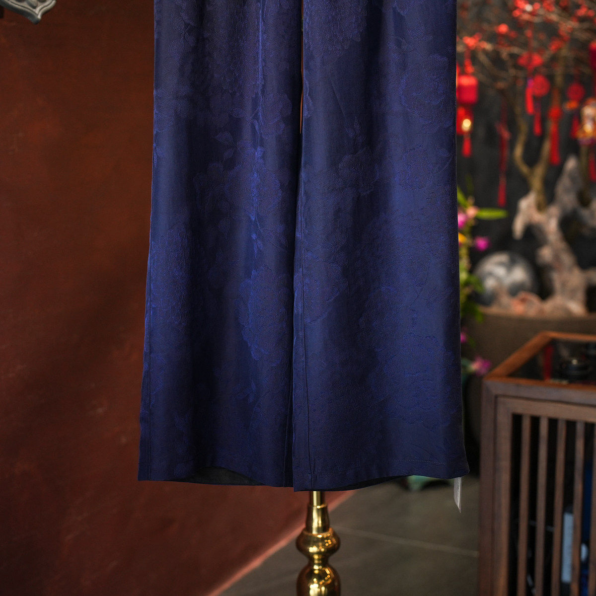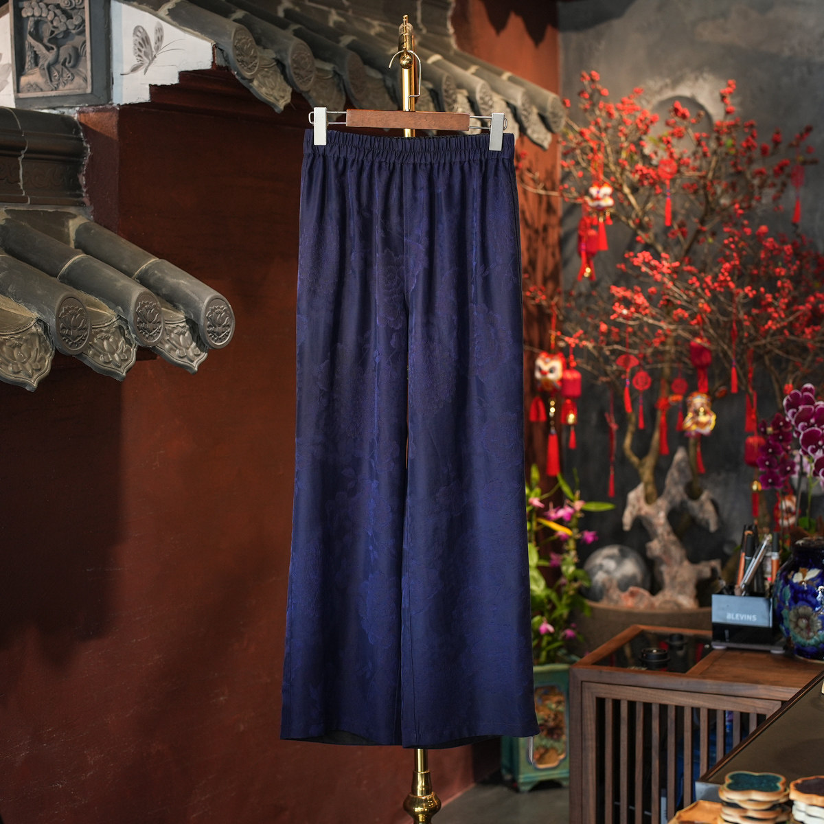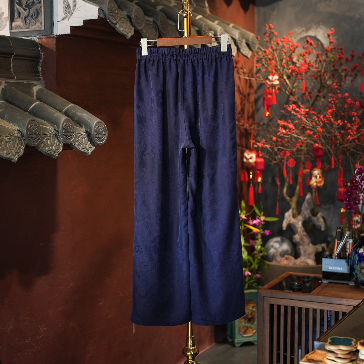 淘宝蓝大原创女装中国风简约蓝色松紧腰阔腿显瘦真丝香云纱休闲裤4068