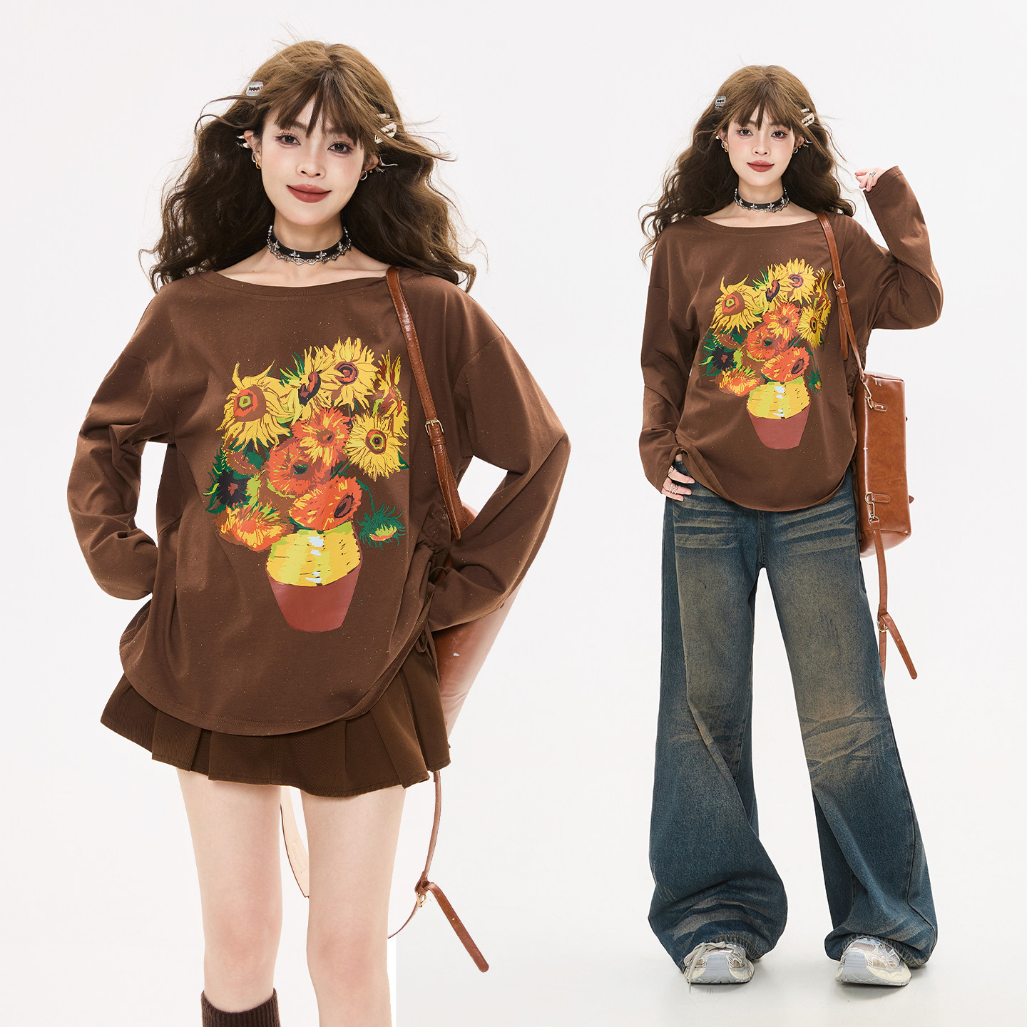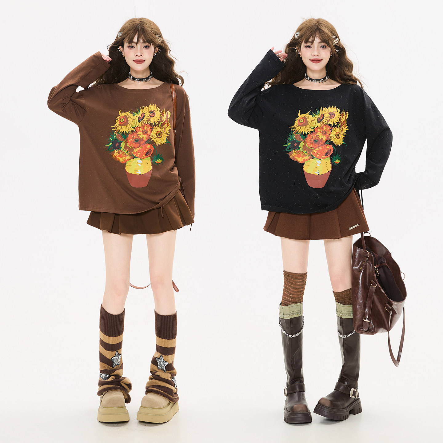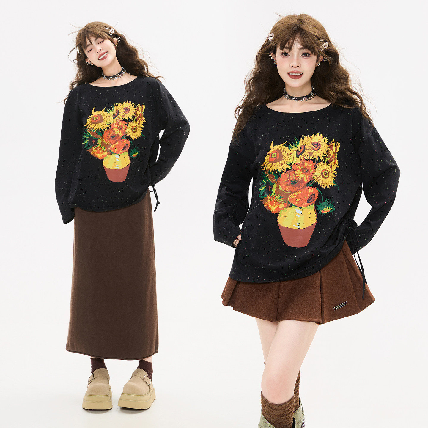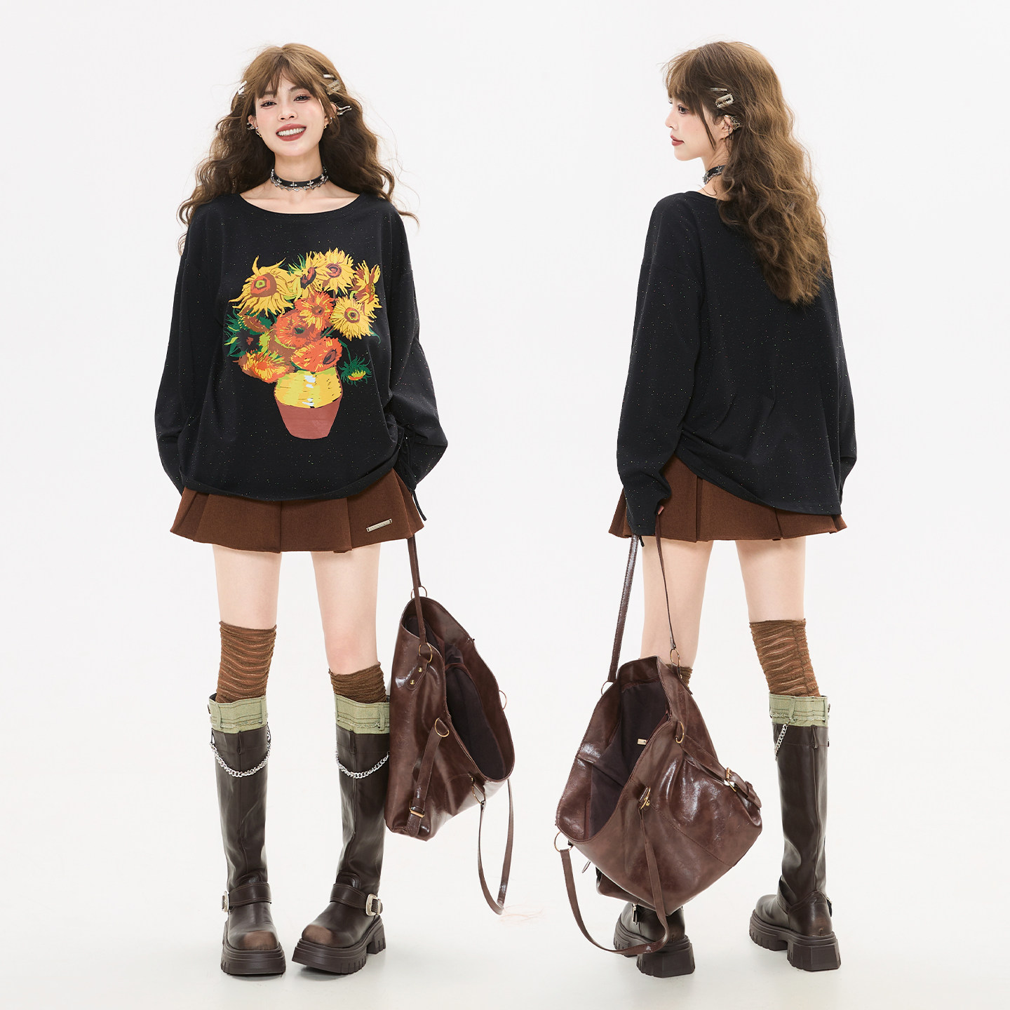 KEIKO 油画风向日葵印花长袖t恤春季新款艺术感出游叠搭薄款卫衣