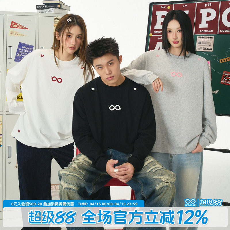 BIPOLAR绣花无限环长袖T恤男女同款春秋季上衣美式基础简约打底衫