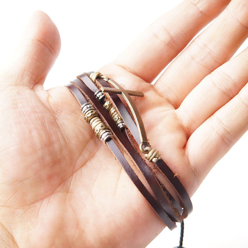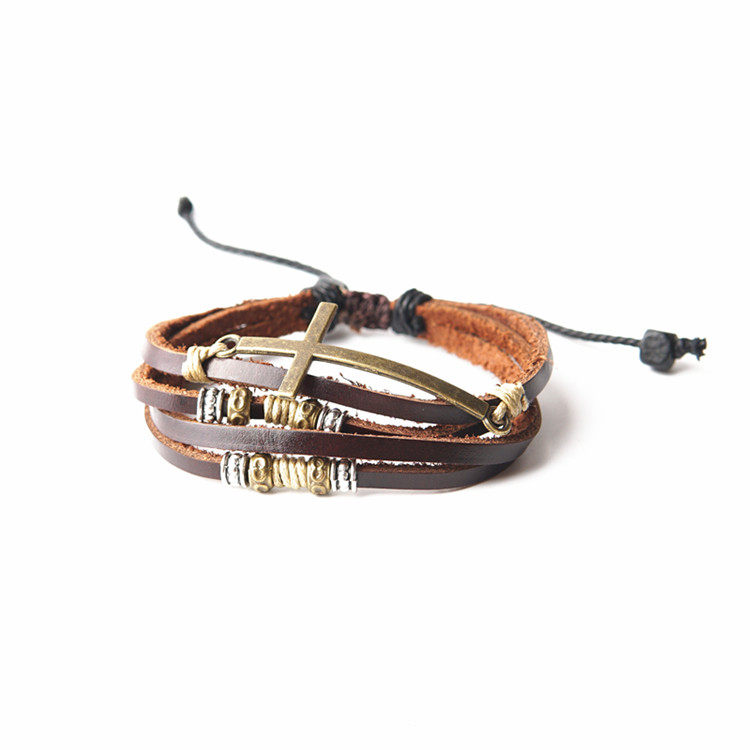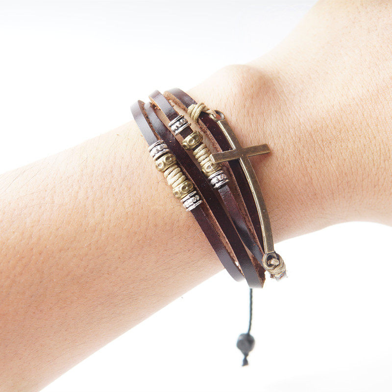淘宝ZC酱潮饰品手工编织男女牛皮手链 古铜十字架多层串 民族风木珠