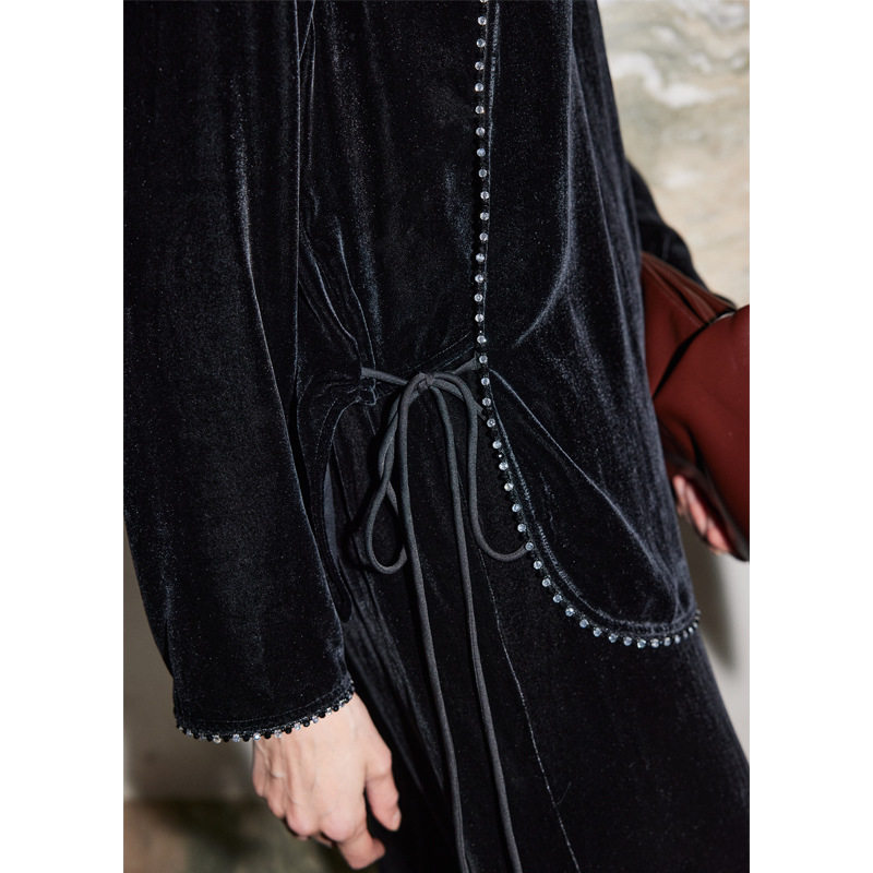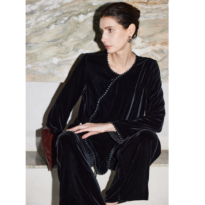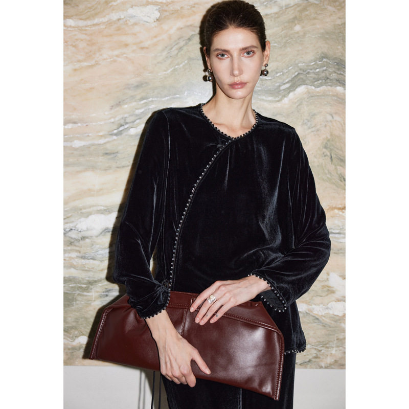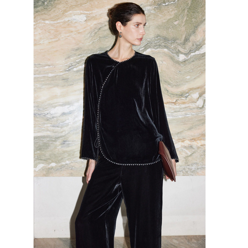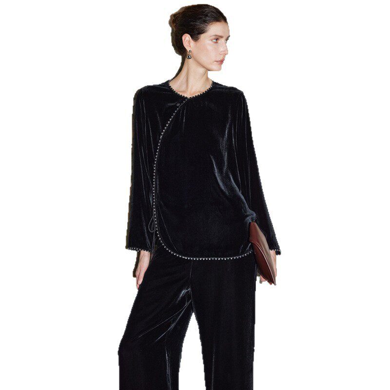 真丝丝绒衬衫女2026年秋冬新款国风新中式纯色手工钉珠桑蚕丝上衣