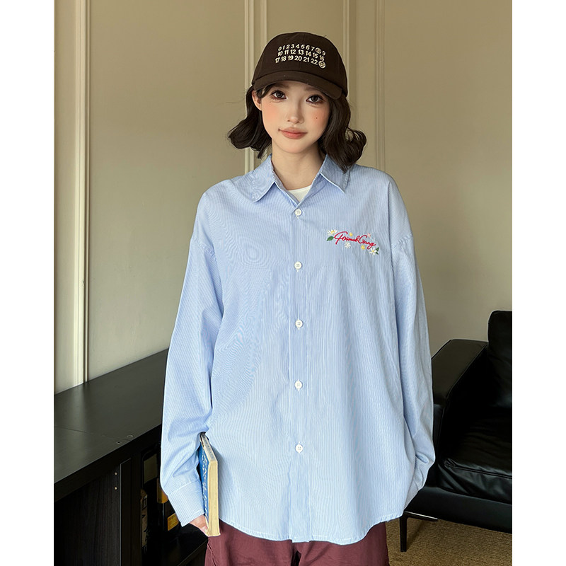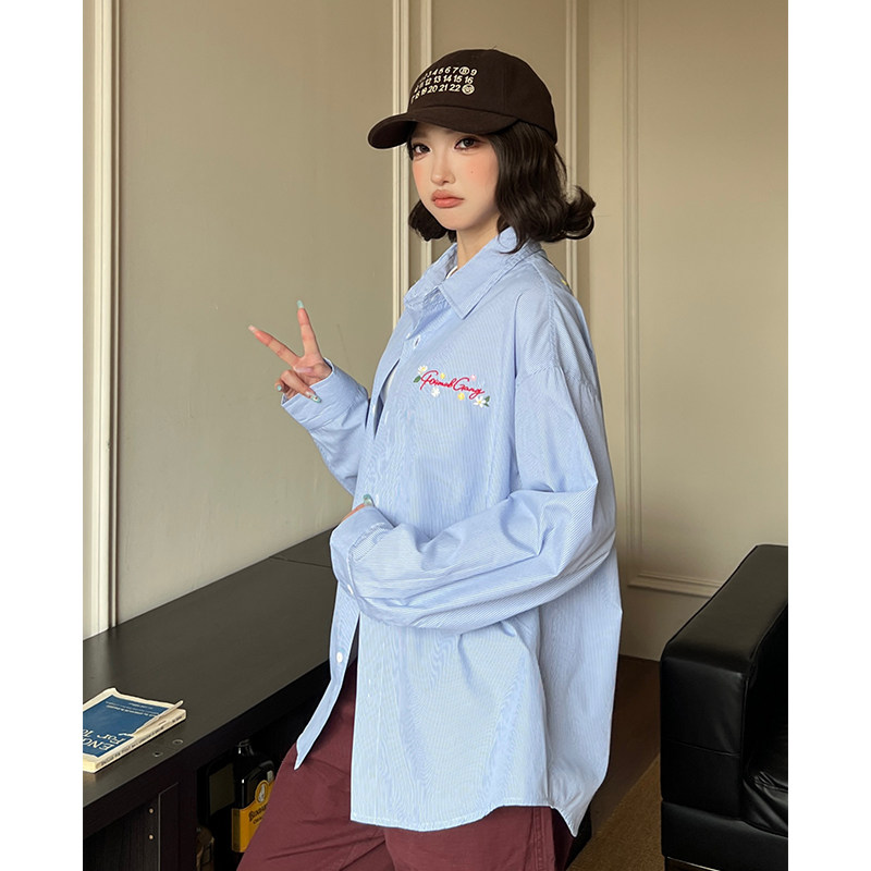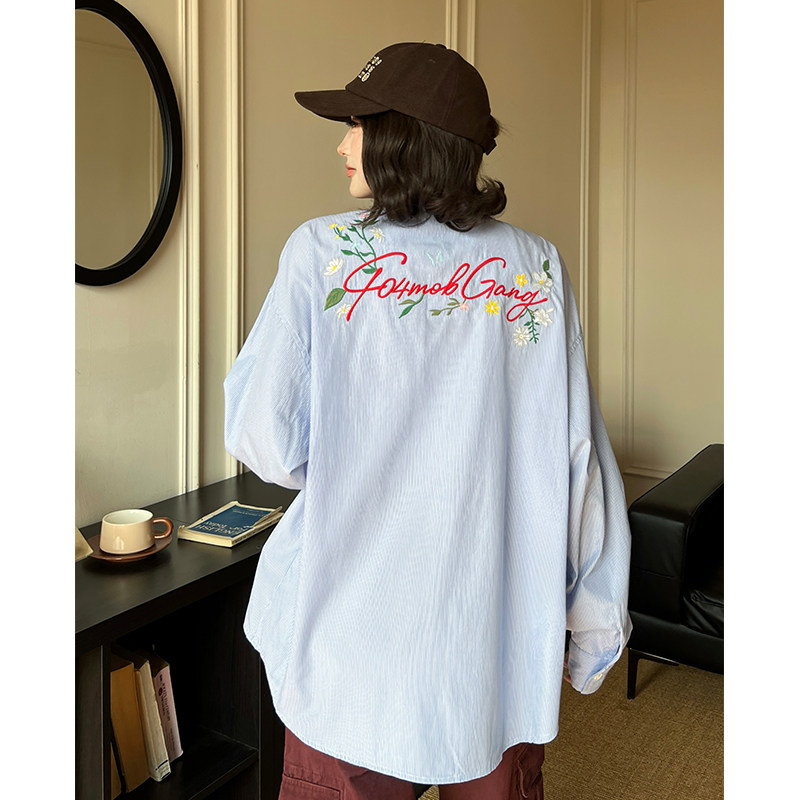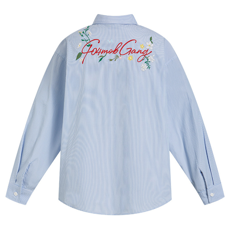 [周柯宇同款]404MOB重工刺绣长袖衬衫中性风Cozyfit蓝色条纹外套