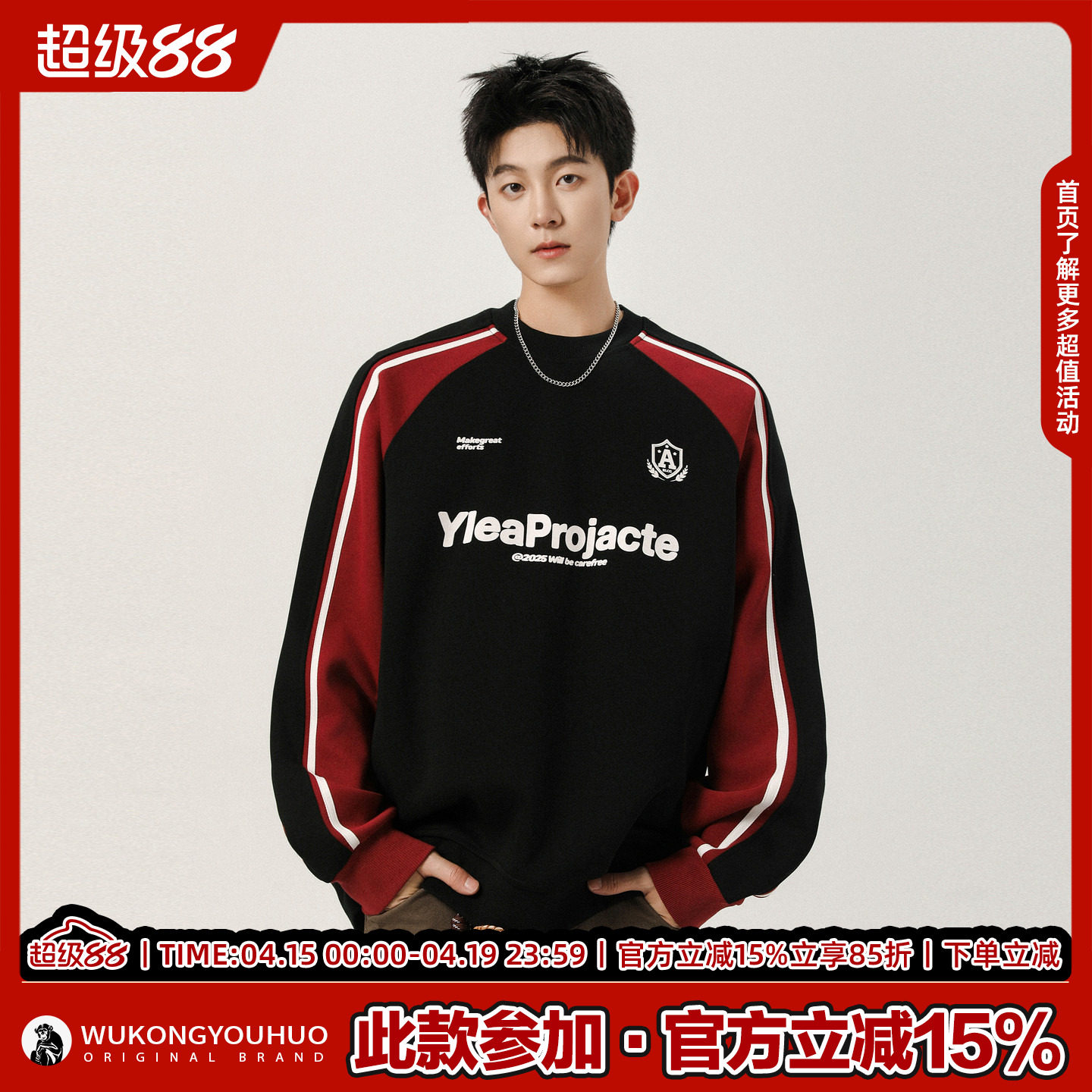 悟空有货美式复古运动插肩袖圆领卫衣男潮牌拼接撞色宽松休闲长袖
