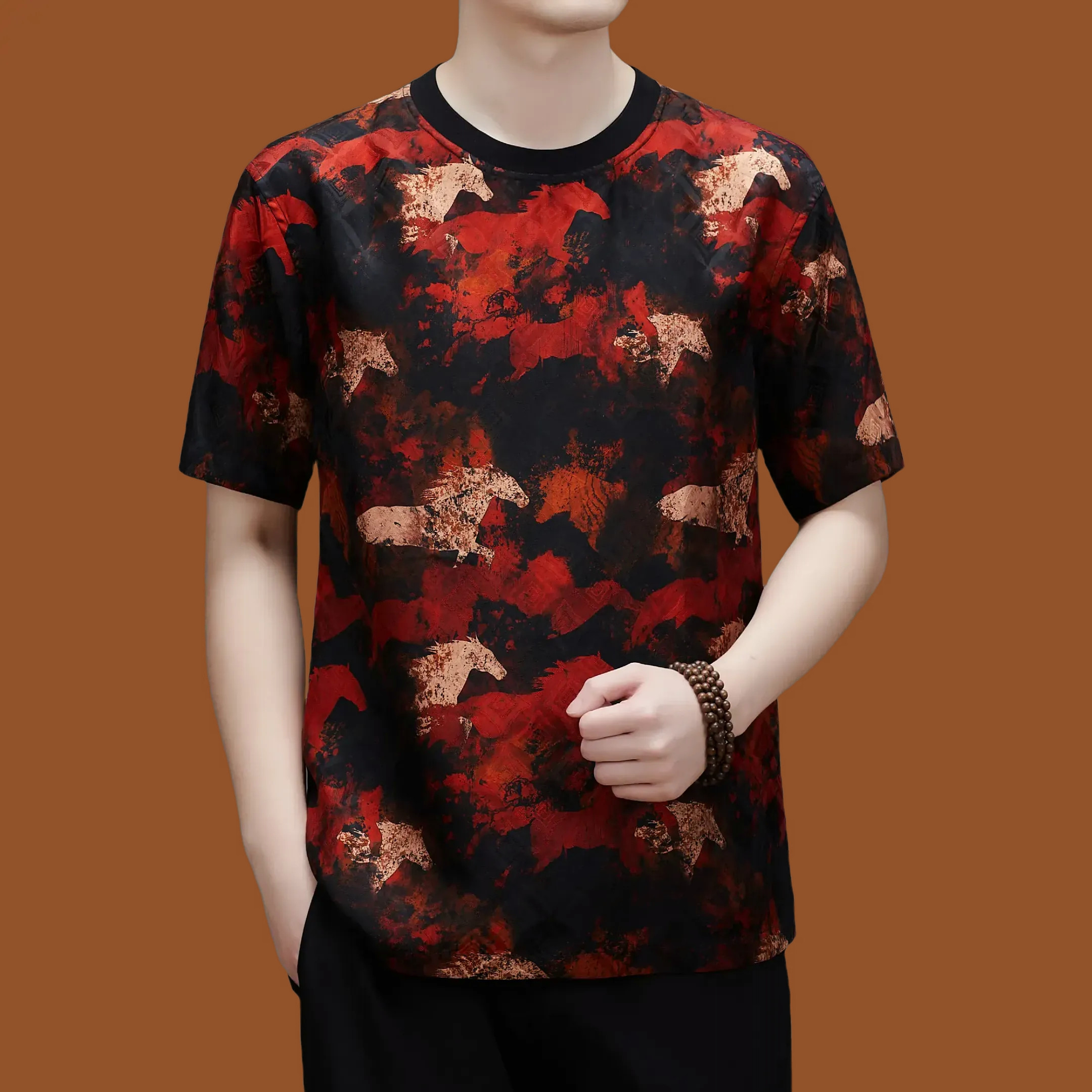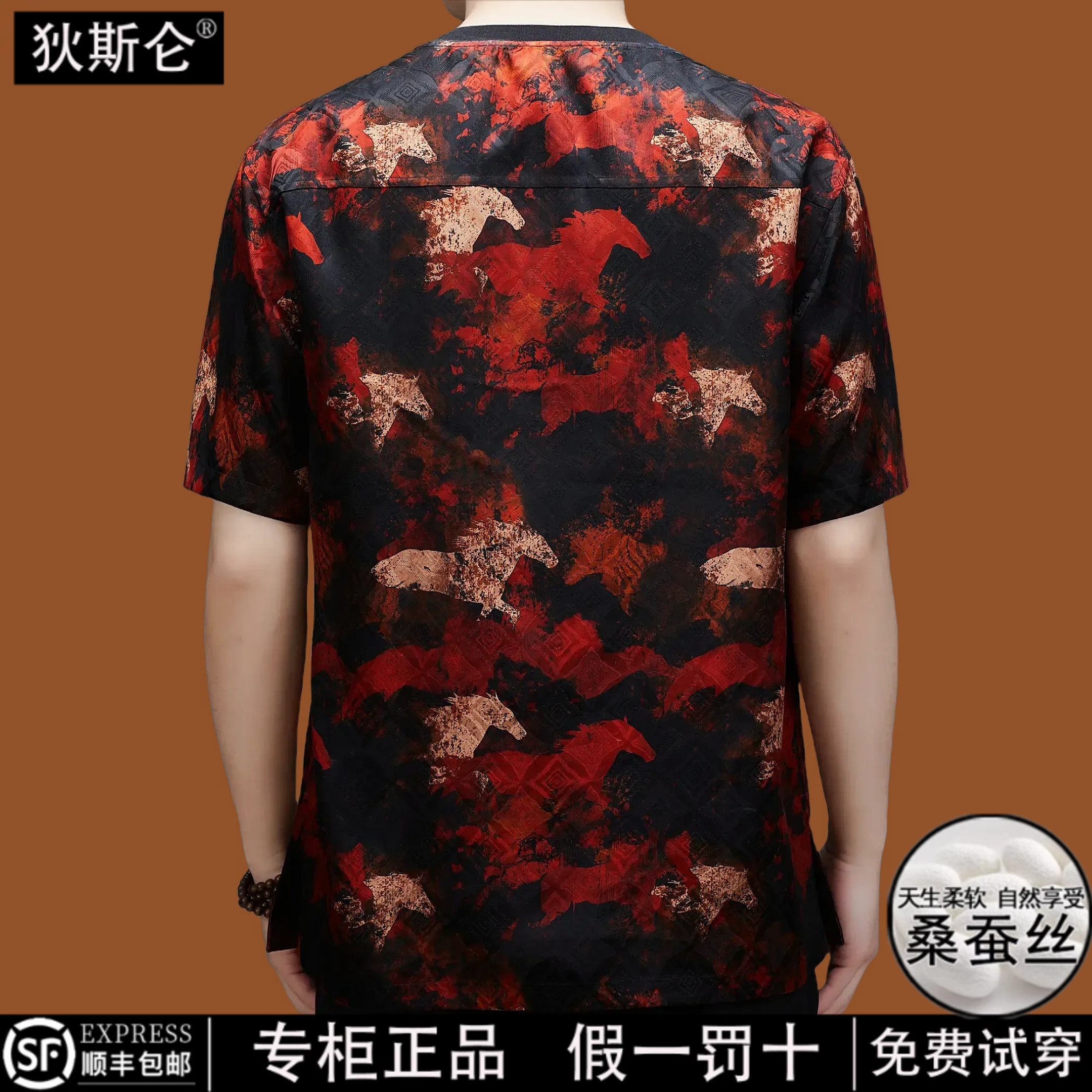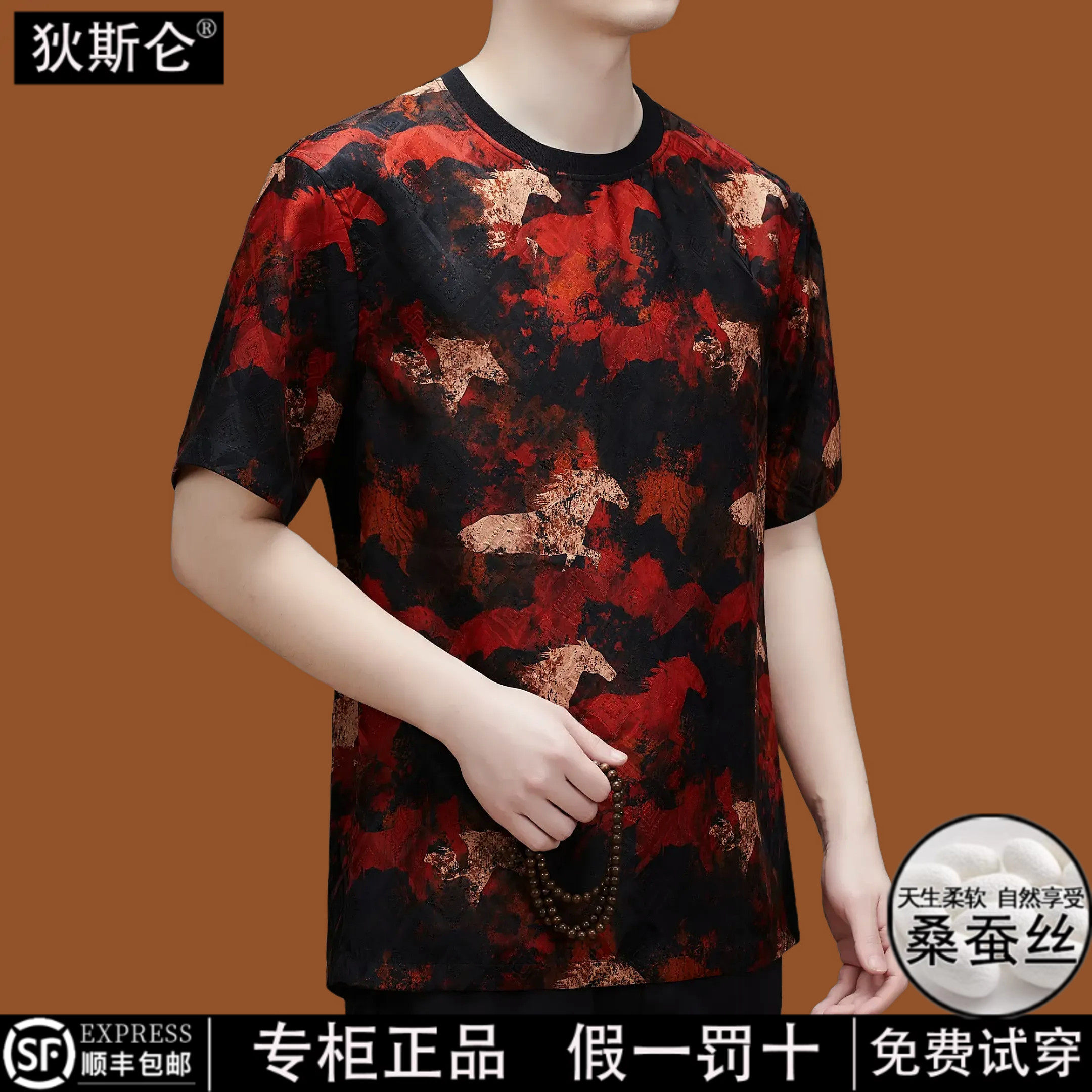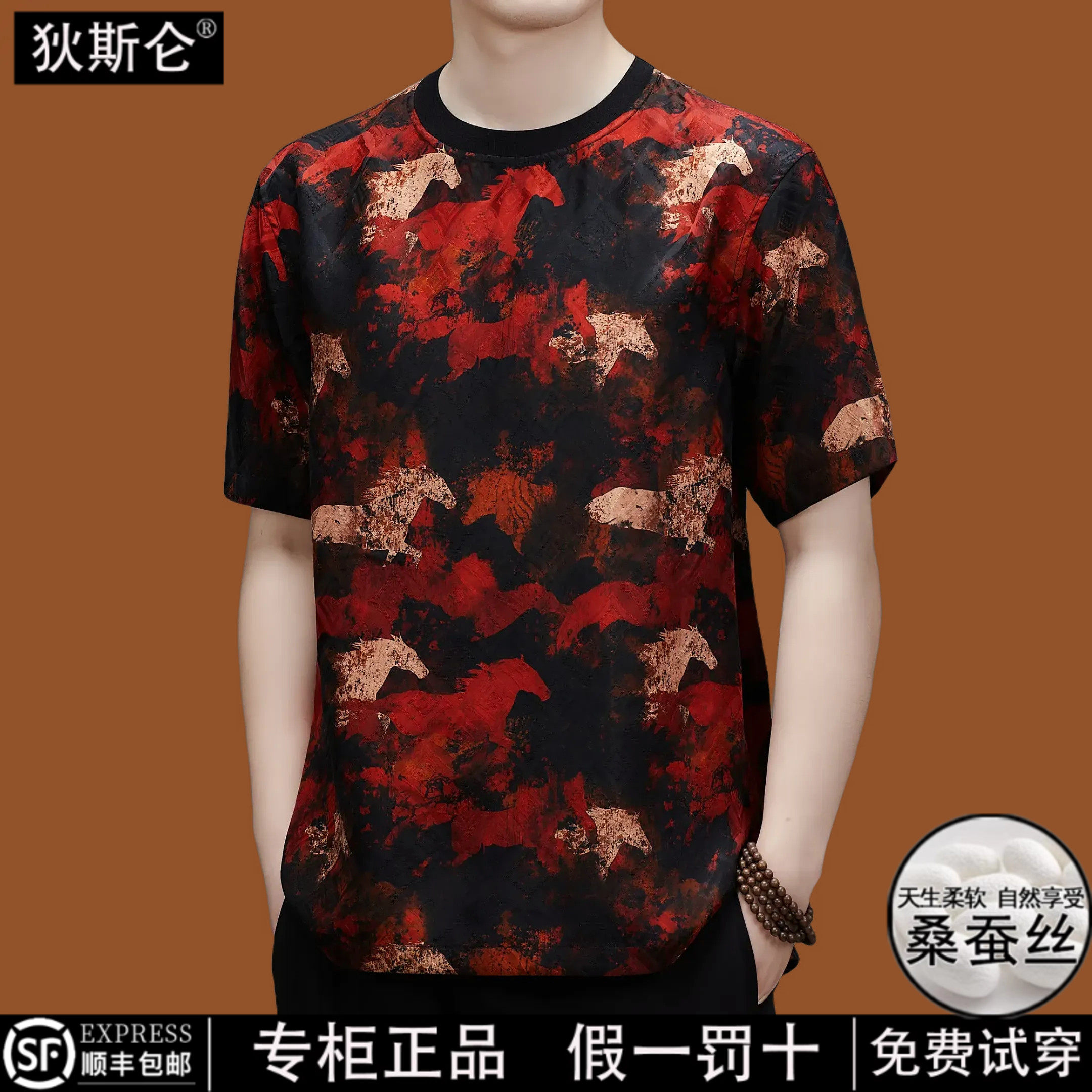 狄斯仑国潮风100%桑蚕丝短袖T恤男圆领马年限定印花红色真丝男装