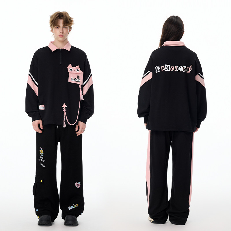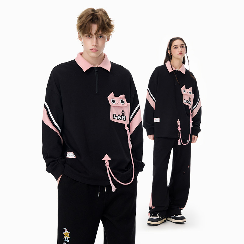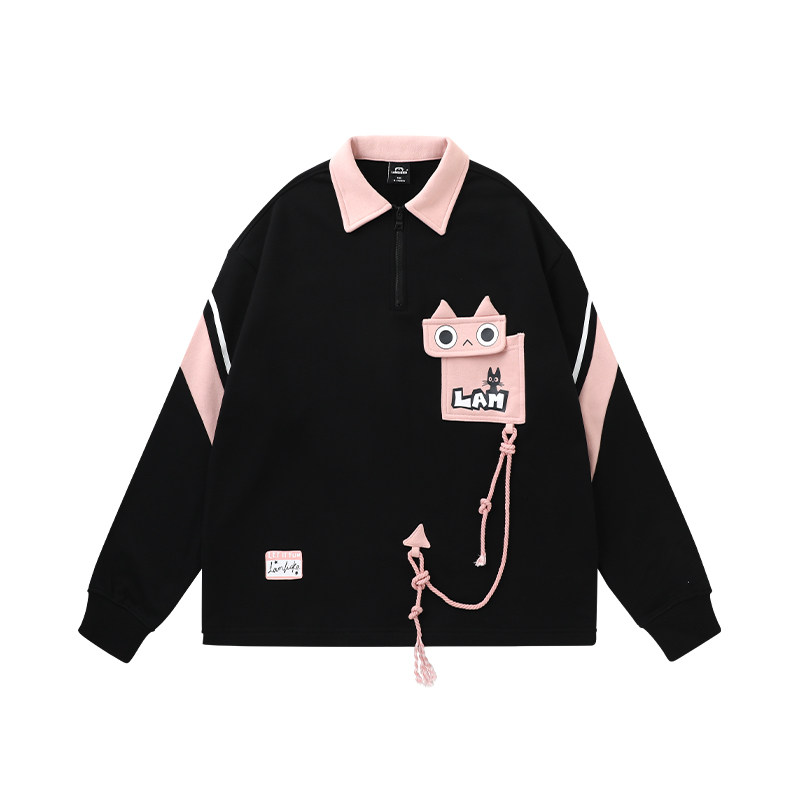 LAMLICKA几何小猫口袋polo长袖上衣拼接外套宽松慵懒风半拉链卫衣