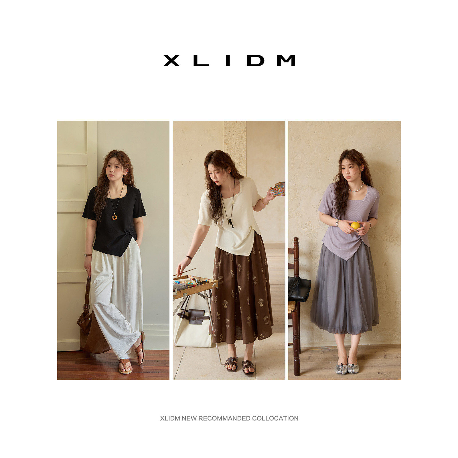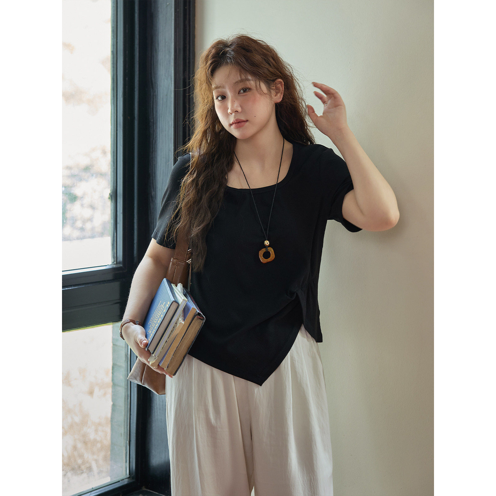 小俪大尺码女装 显瘦十斤!遮肚抽皱不规则开 叉U领正肩短袖T恤女