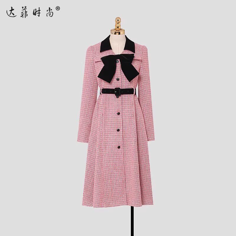 2026春款小香风撞色丝绒蝴蝶结收腰A摆中长款毛呢外套
