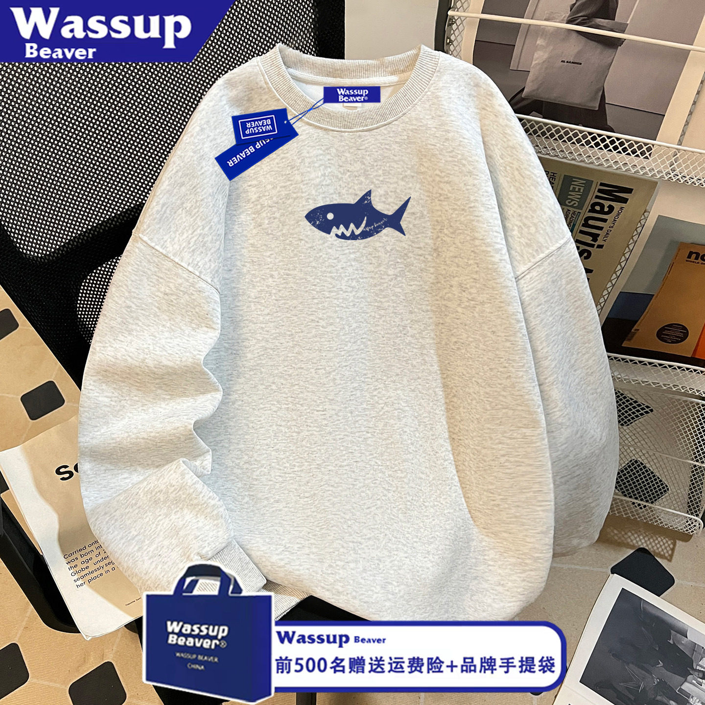 --------------------- WASSUP BEAVER重磅设计感巨齿大白鲨加绒圆领卫衣宽松休闲情侣装 【原售价】109元 【现售价】68.6元 【推荐理由】