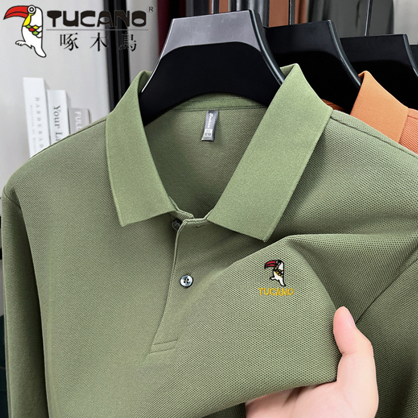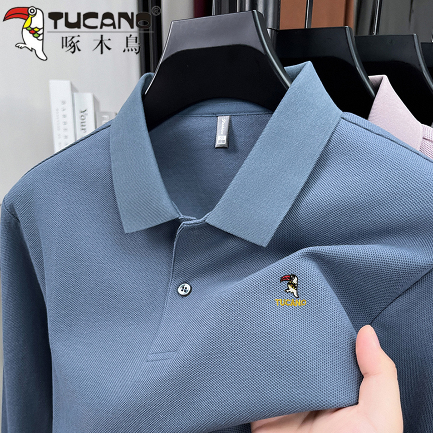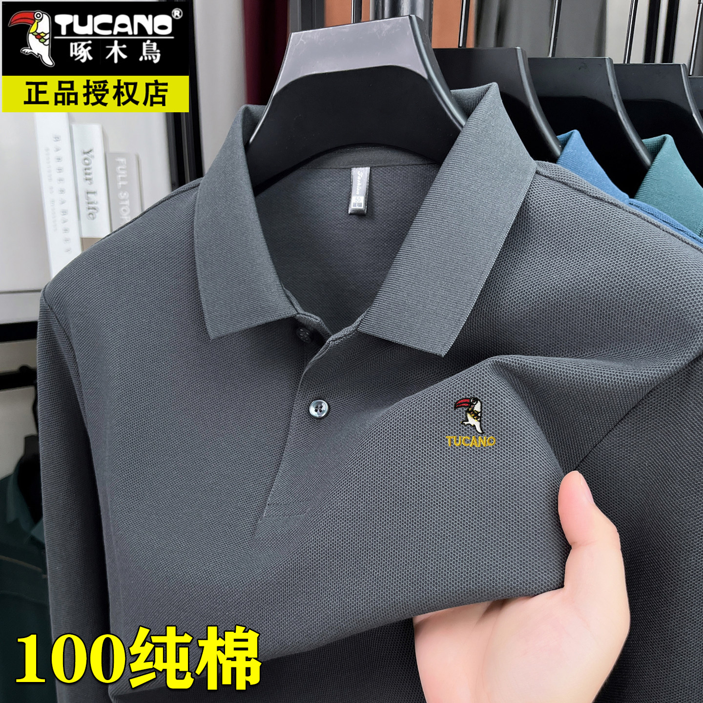 啄木鸟100%纯棉男士长袖t恤翻领POLO衫下摆开叉中年春秋高端上衣