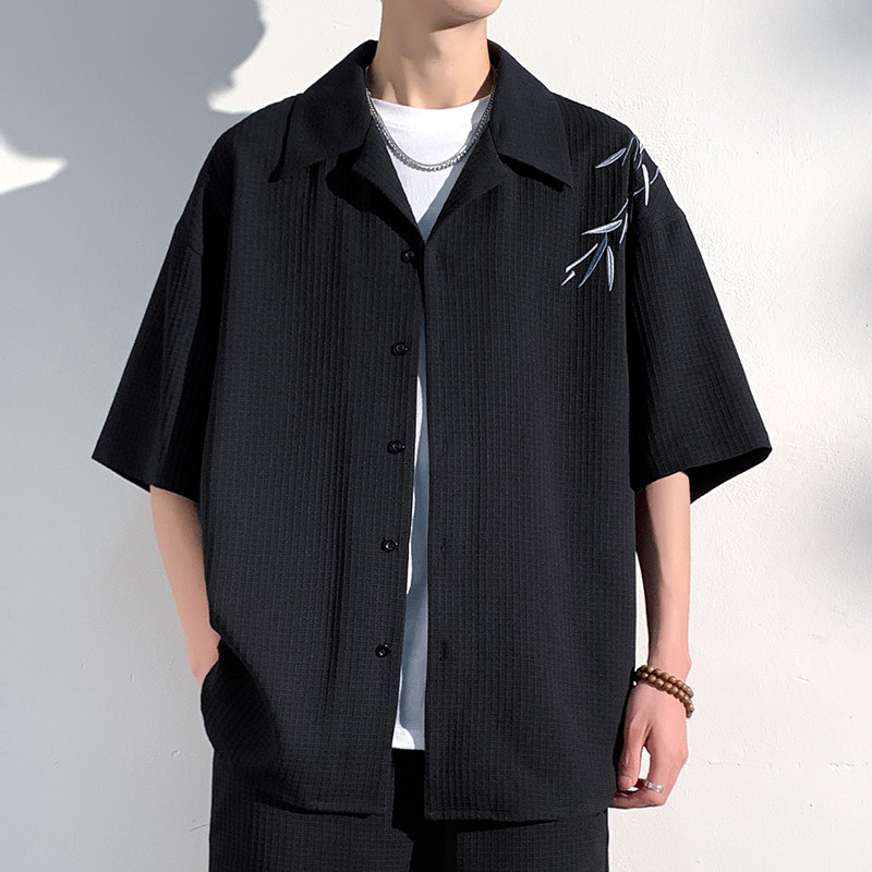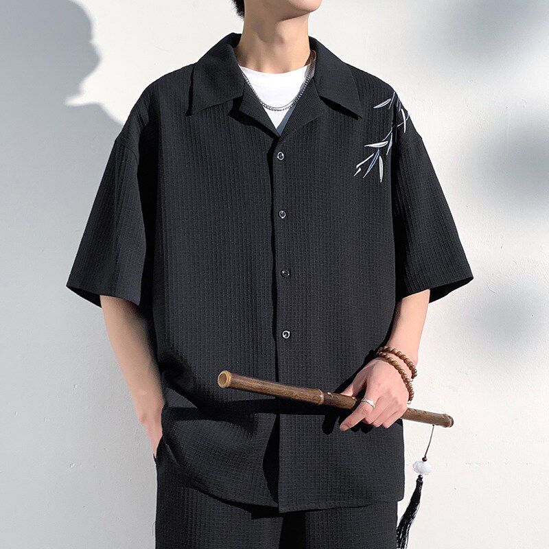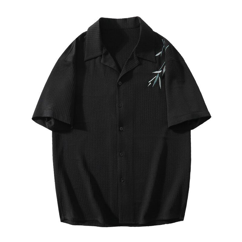 竹叶刺绣短袖衬衫男士夏季新中式风国潮设计感小众宽松五分袖衬衣