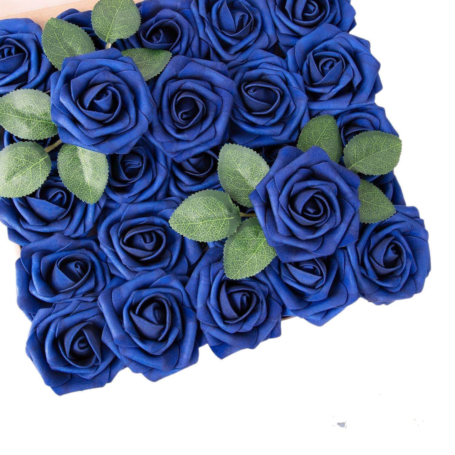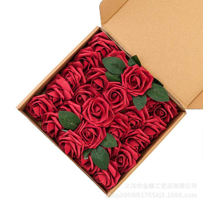 跨境欧式盒装25朵仿真花pe玫瑰花头8cm带杆 婚礼情人节圣诞仿真花