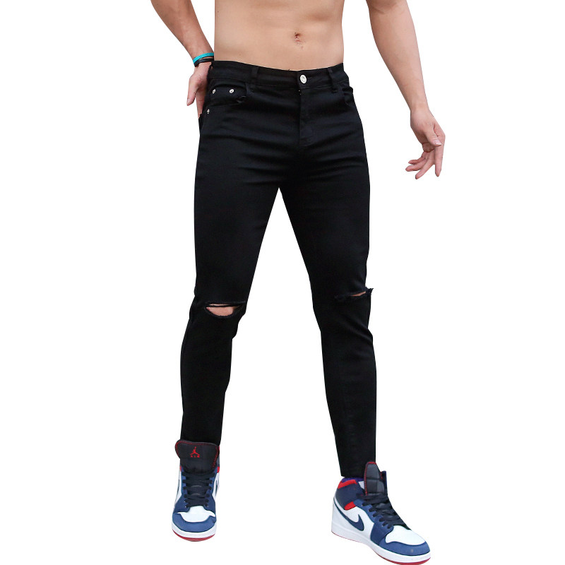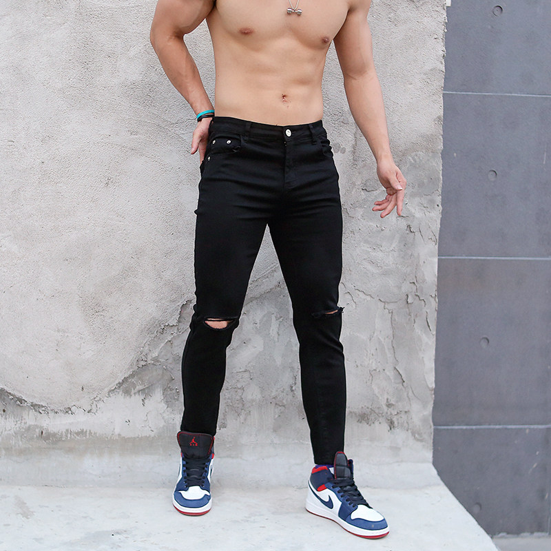 辉先生夏季新款男士牛仔裤弹力破洞割破小脚裤休闲健身修身九分裤