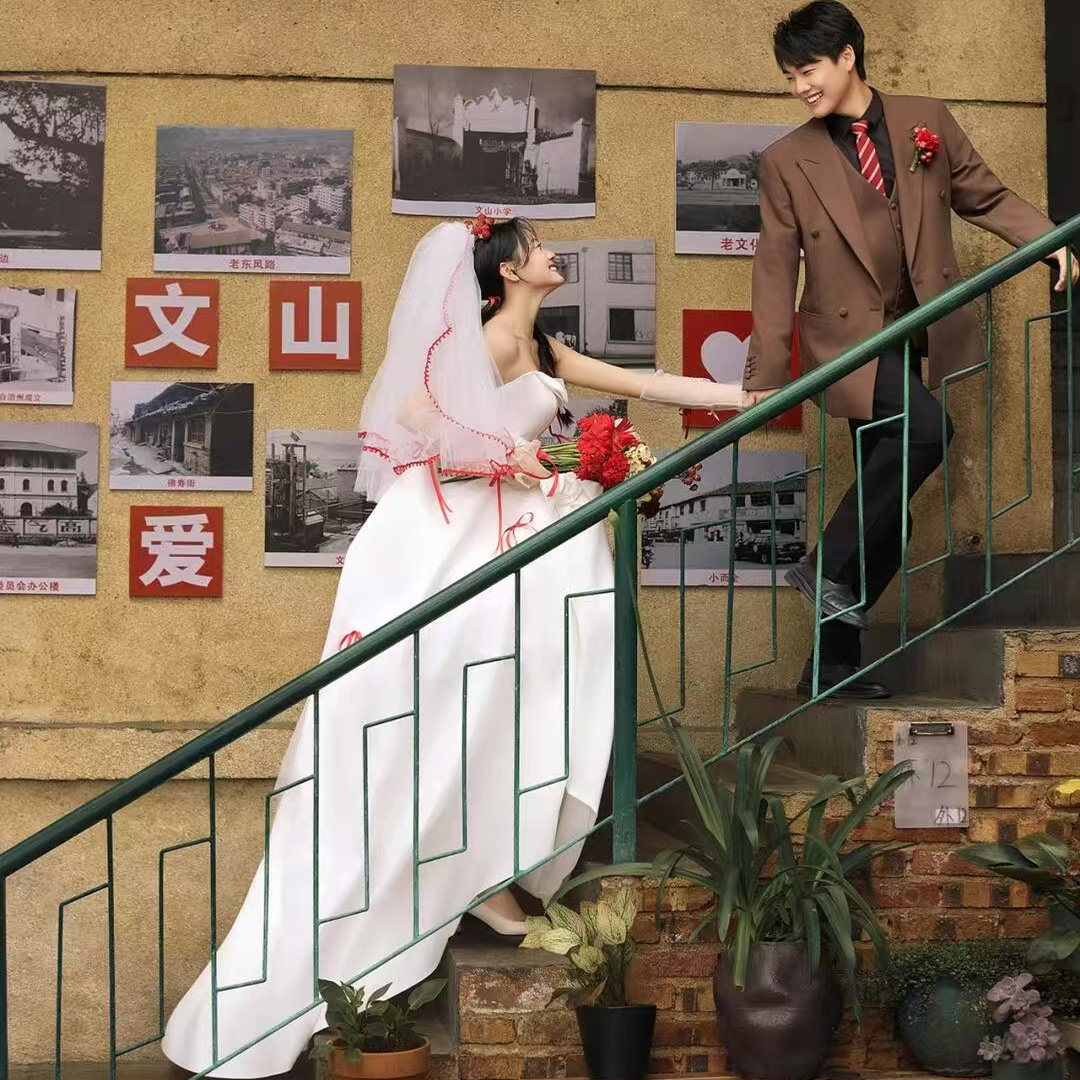 影楼新款婚纱礼服白色蝴蝶结抹胸外景摄影拍照主题街拍复古喜嫁风