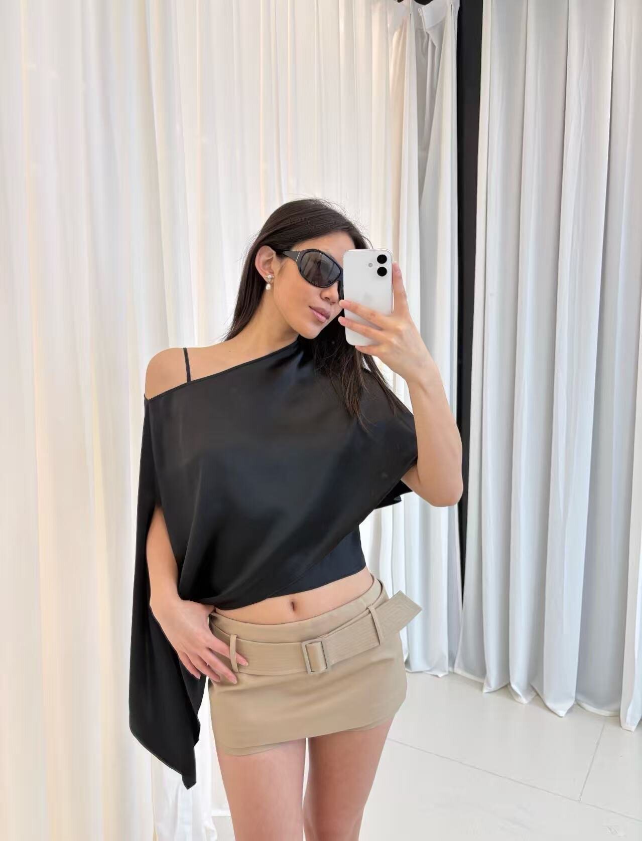 R*A 极简风卡其色宽腰带设计感mini短裙 辣妹显瘦低腰A字半身裙裤
