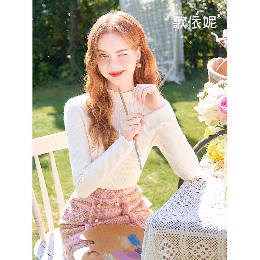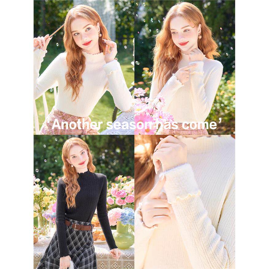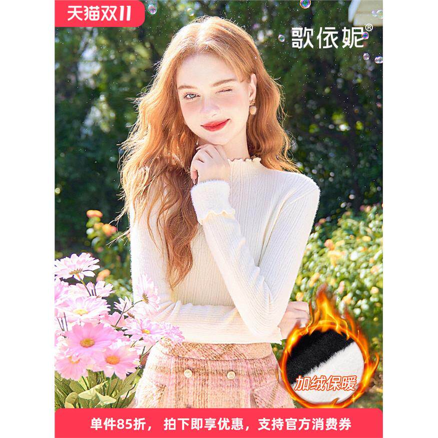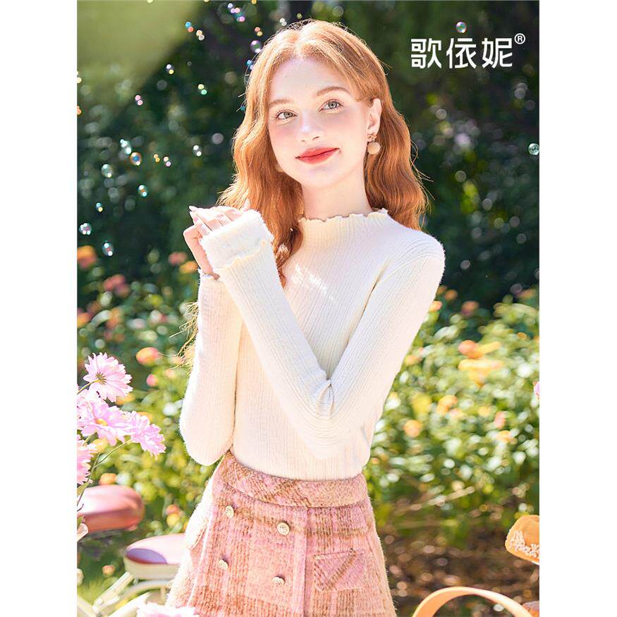 歌依妮2025秋冬新款白色加绒加厚木耳边内搭打底衫毛衣针织衫上衣
