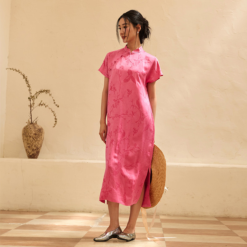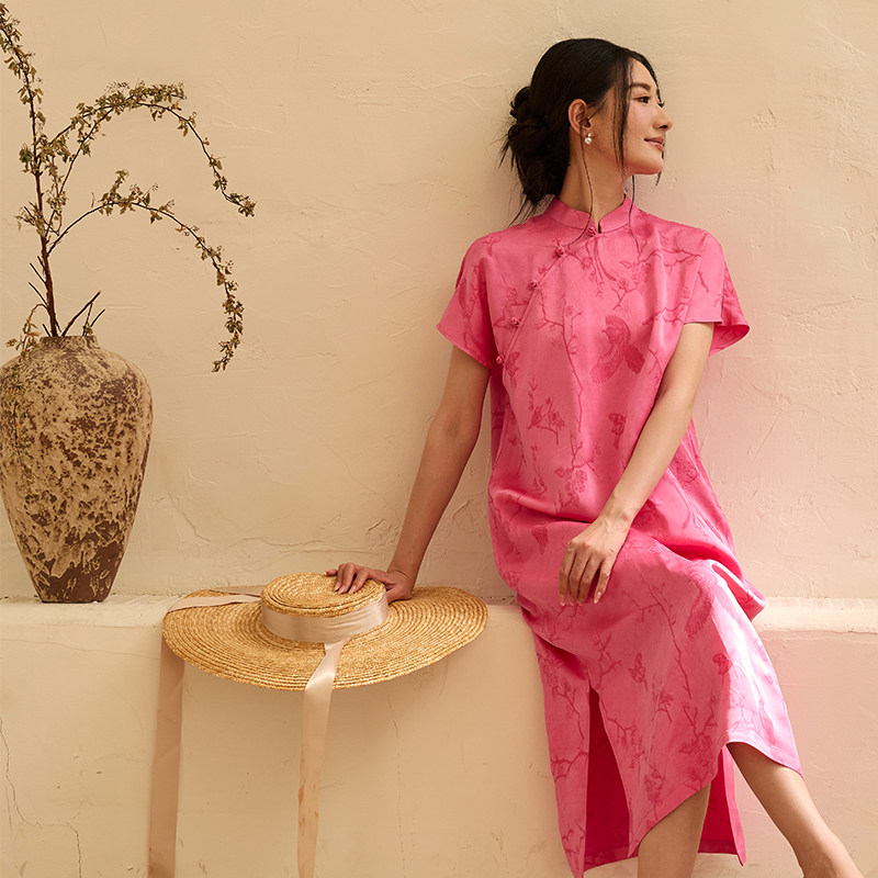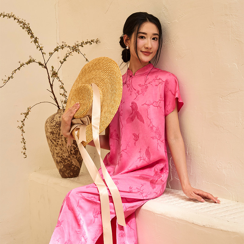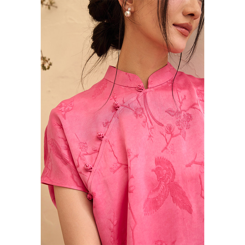--------------------- 桃知窈窈2025夏/喜上眉梢 中式花鸟纹立领短袖改良旗袍裙桃粉色 【原售价】458元 【现售价】350元 【推荐理由】