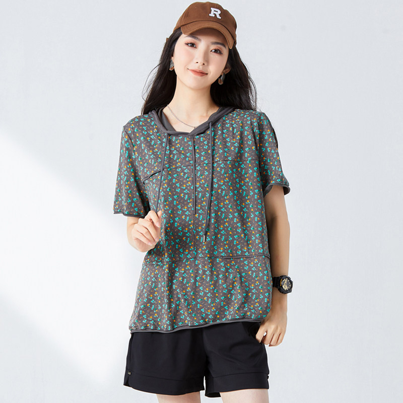 淘宝大码女装夏装200斤胖mm洋气时尚连帽上衣胖妹妹宽松显瘦休闲T恤衫