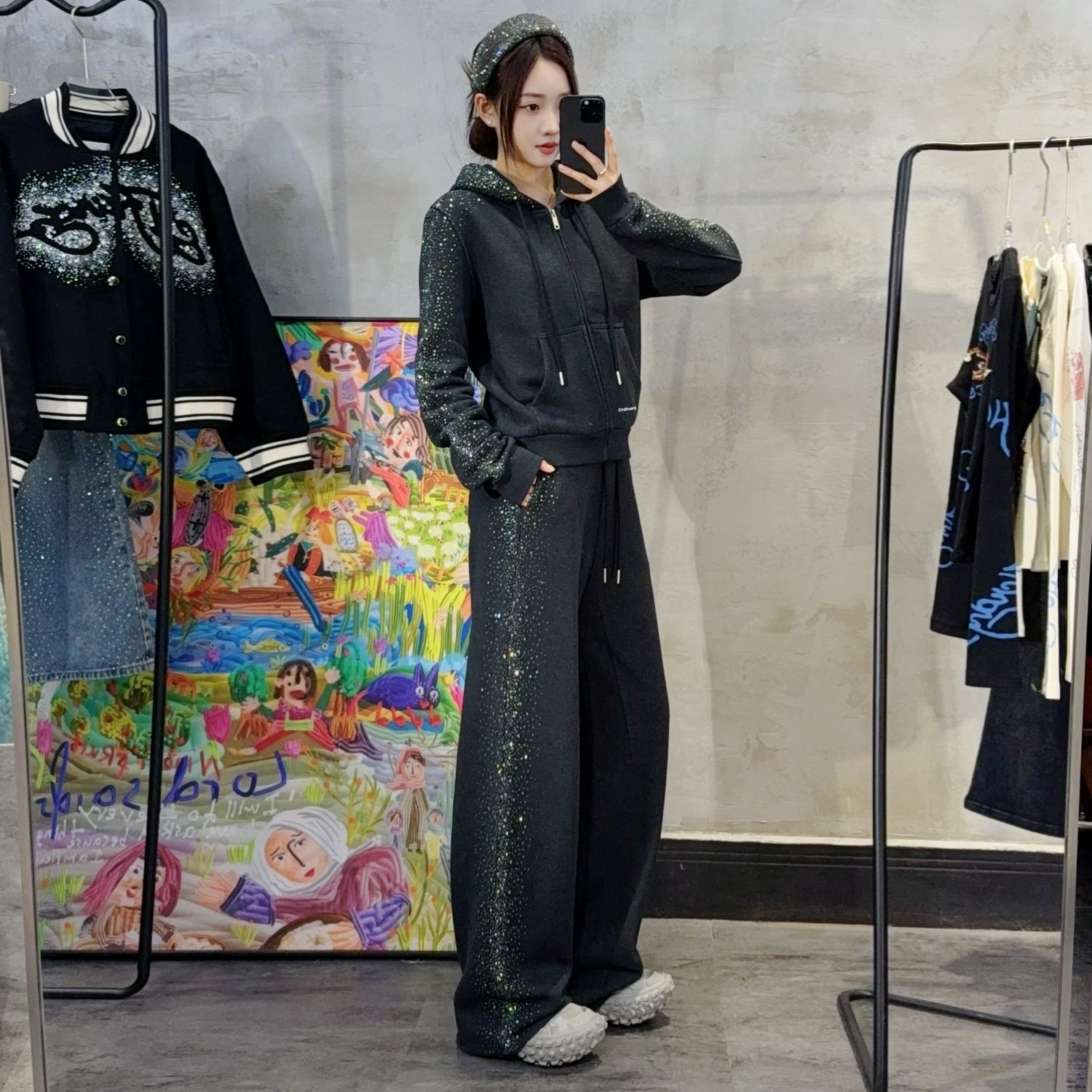 爆闪银河系烫钻连帽短款外套拉链加绒卫衣拖地阔腿弯刀裤潮牌套装
