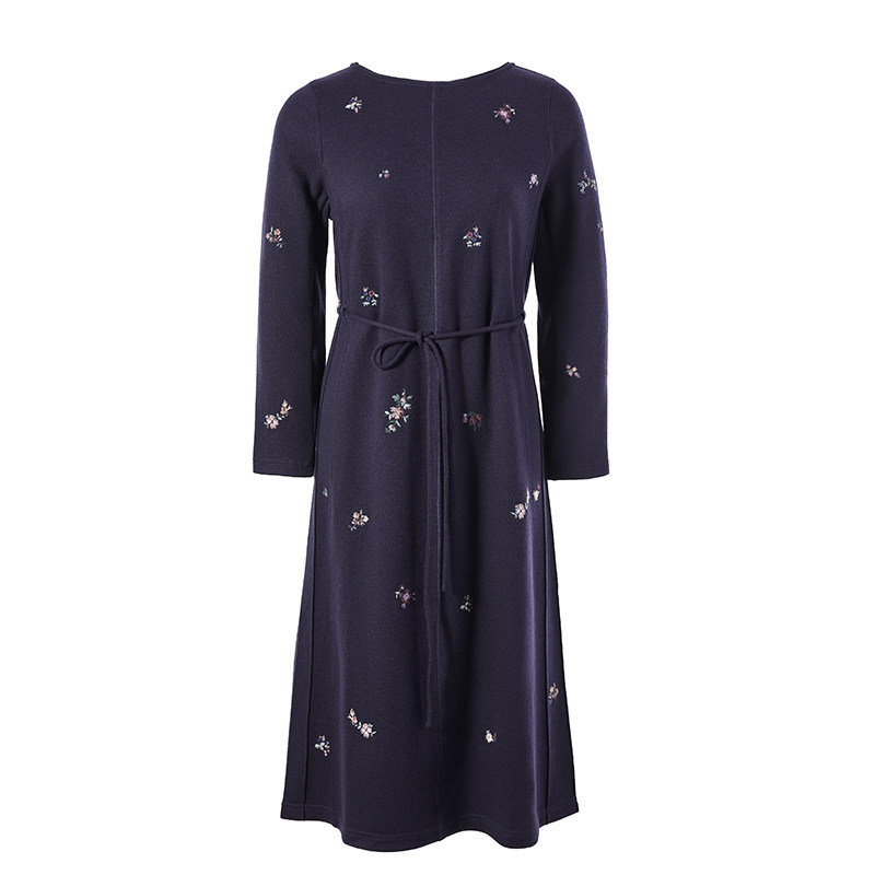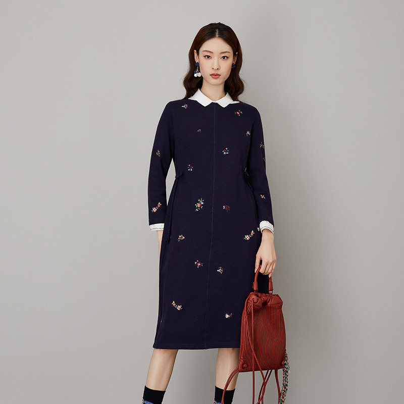 渔牌女装秋装女2023年新款呢刺绣针织系带收腰连衣裙FGFC0015