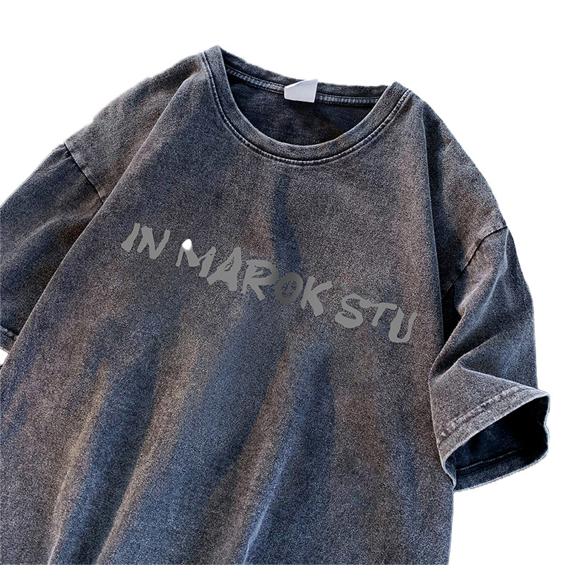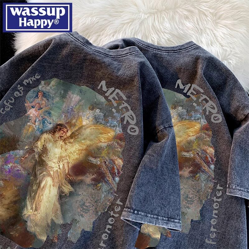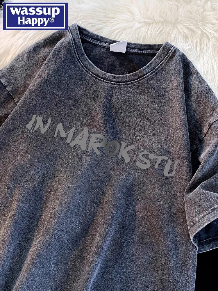 wassup happy美式复古短袖t恤男夏季水洗做旧上衣服潮流潮牌体恤