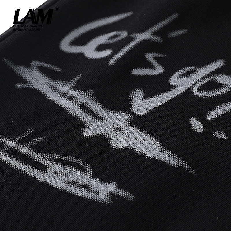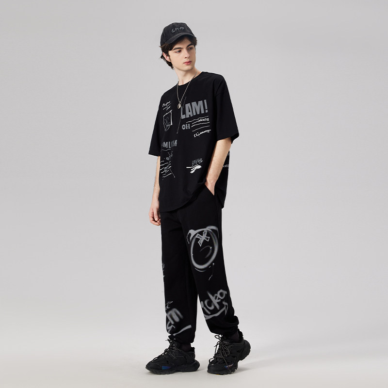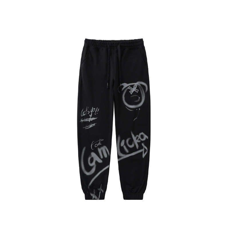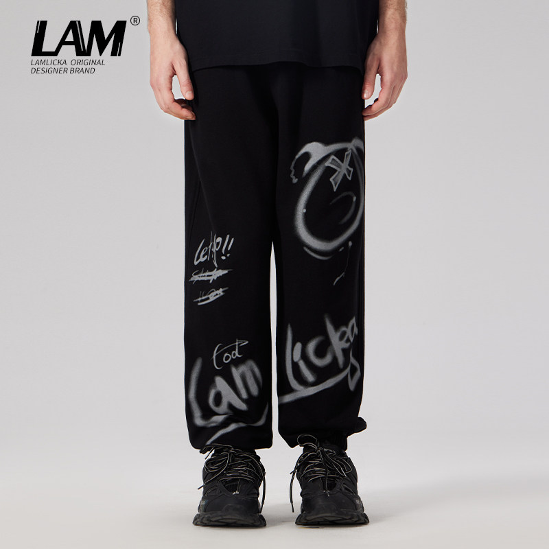 LAMLICKA涂鸦熊猫印花休闲卫裤男国潮小众设计感束脚黑色长裤宽松