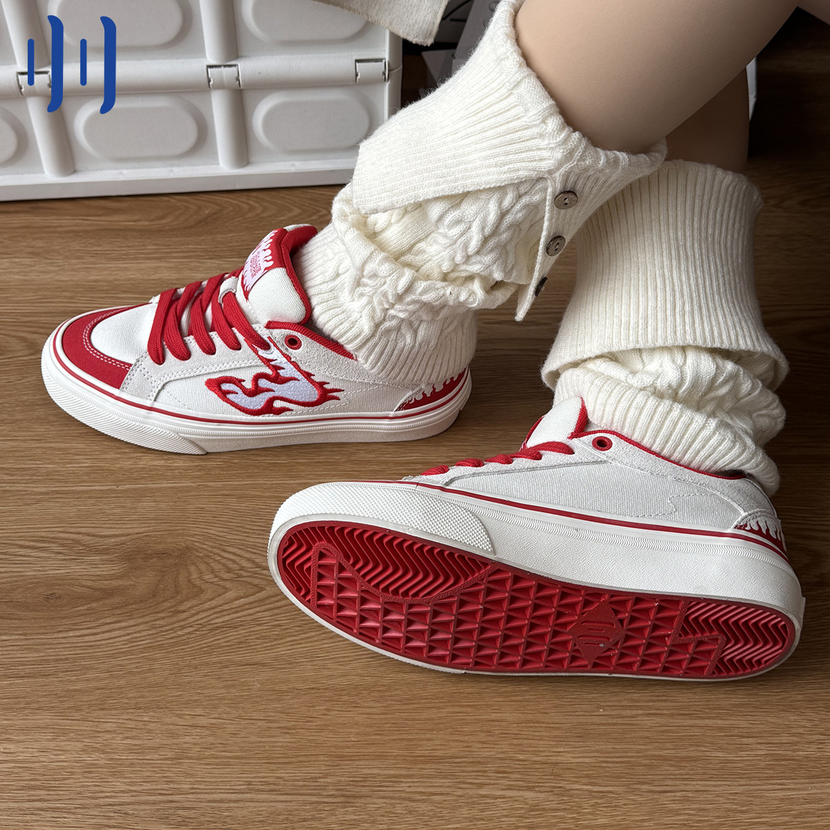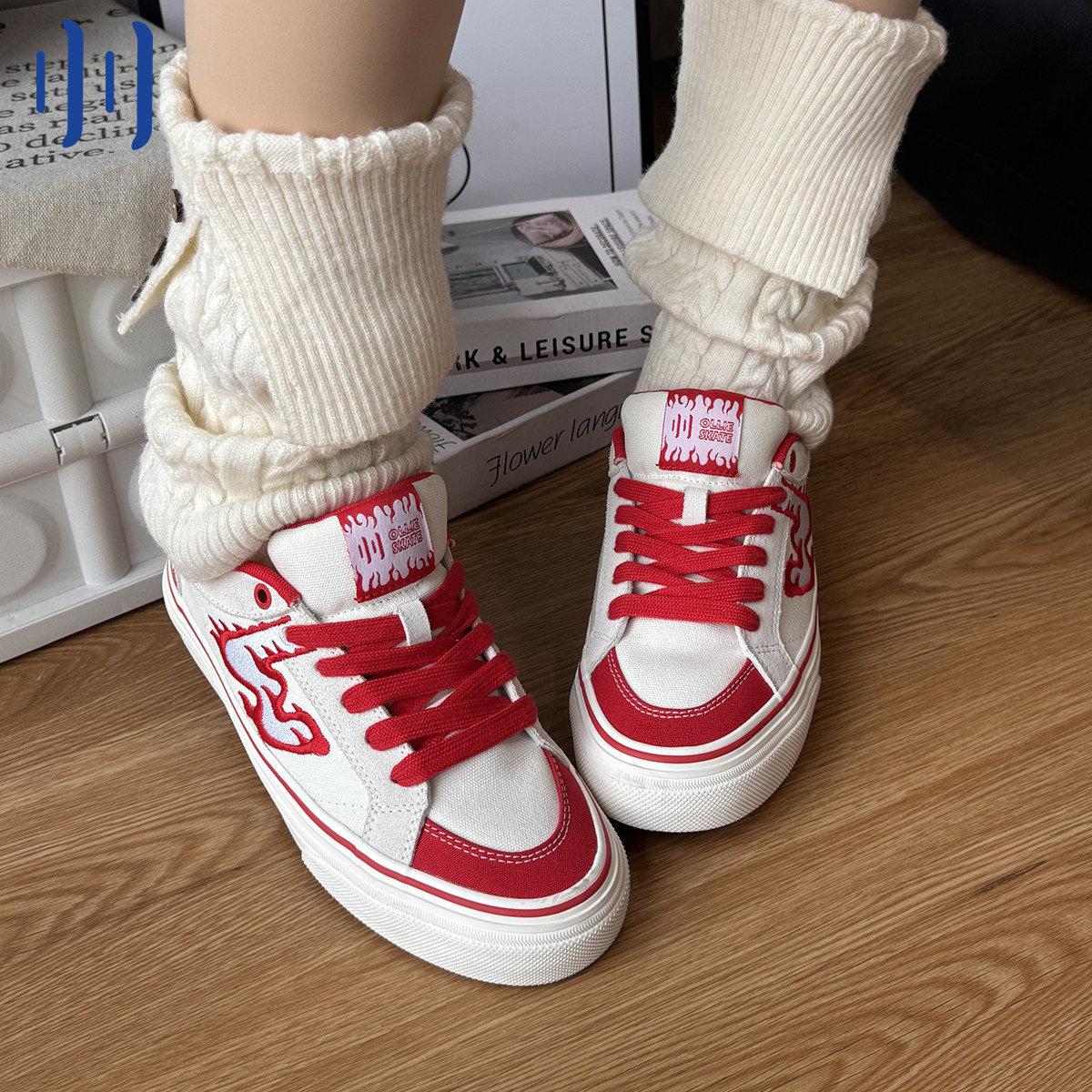 顽刻ollieskate白红火焰刺绣配色春季校园风W系列男女国潮滑板鞋