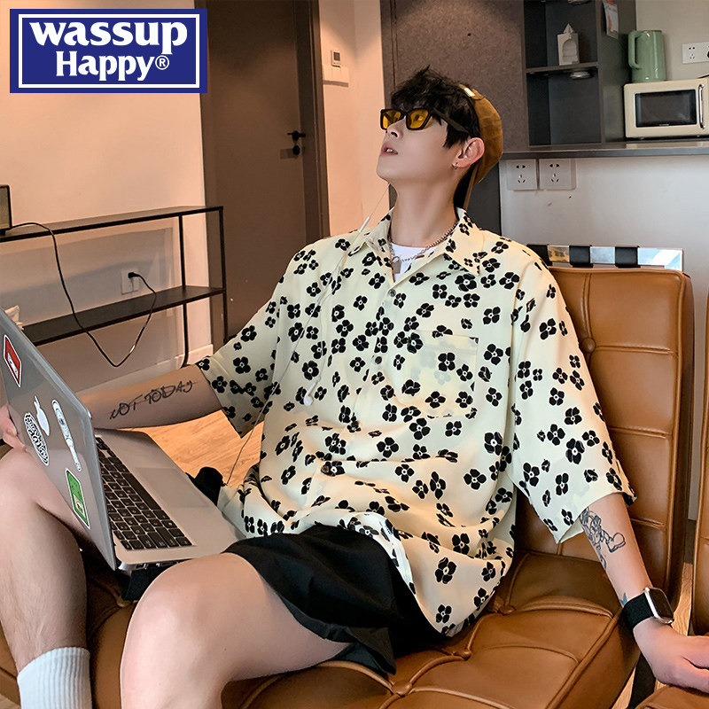 wassup happy冰丝薄款花衬衫男夏季宽松休闲短袖衬衣潮牌潮流上衣