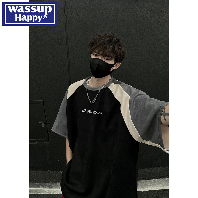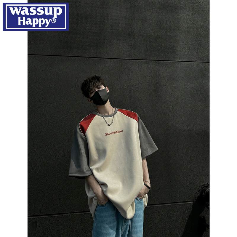 wassup happy仿麂皮绒短袖t恤男款夏季拼接撞色设计感半袖上衣服