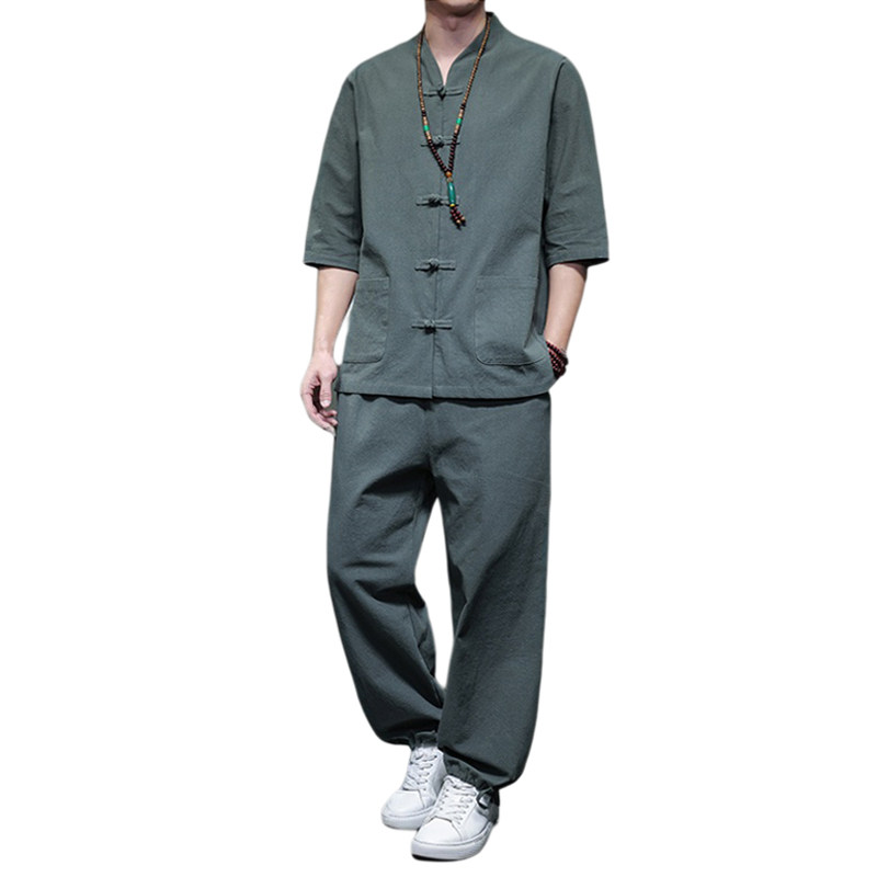 潮牌亚麻套装男夏季透气唐装中国风短袖衬衫新中式大码棉麻两件套